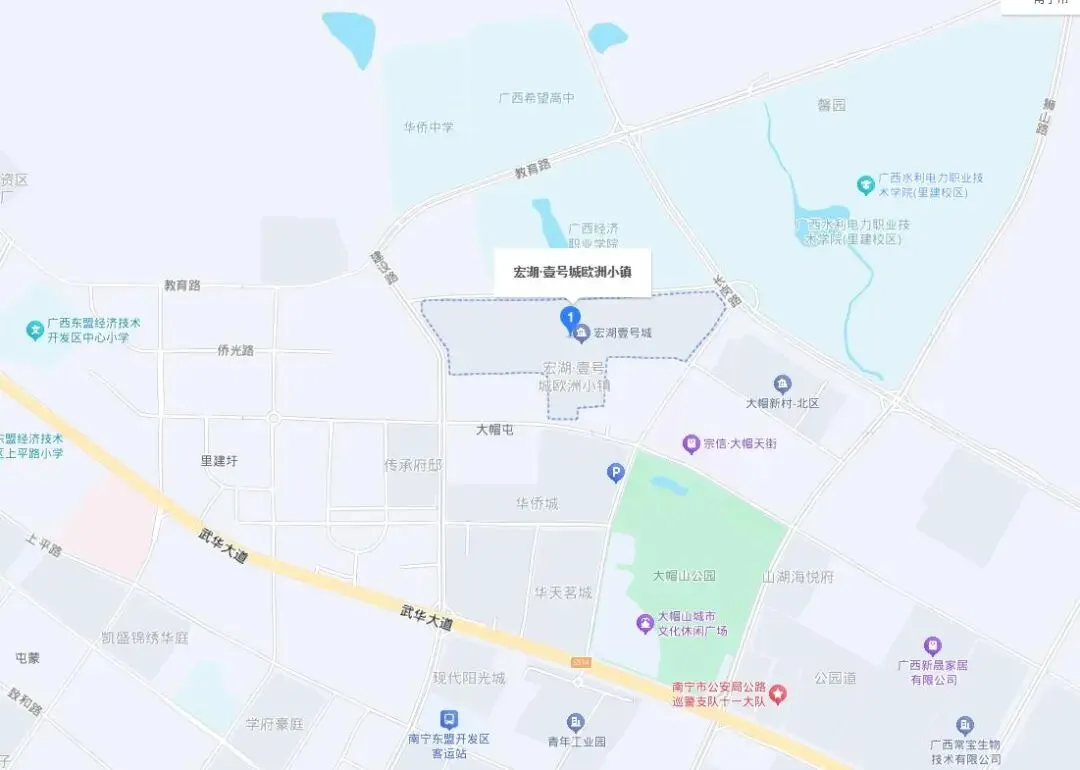 此次拍卖的29栋联排楼房所在小区宏湖·壹号城欧洲小镇,位于南宁市武鸣区的广西-东盟经济技术开发区,小区区位比较特别,就在广西经济职业学院和广西水利电力职业技术学院(里建校区)两所大专院校旁边。此外旁边还有广西希望高中和华侨中学两所高中,附近居住小区也不少。