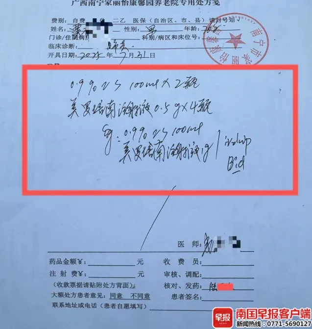 近日,南宁的粟先生反映,他将患有多种慢性病的76岁父亲送至南宁市家丽怡康馨园养老院(以下简称养老院)接受护理。其间,老人手上的痛风石破裂,辗转多家医疗机构治疗后,粟先生将其送回养老院,18天后老人去世。粟先生质疑养老院在老人返院后违规使用抗菌药物。