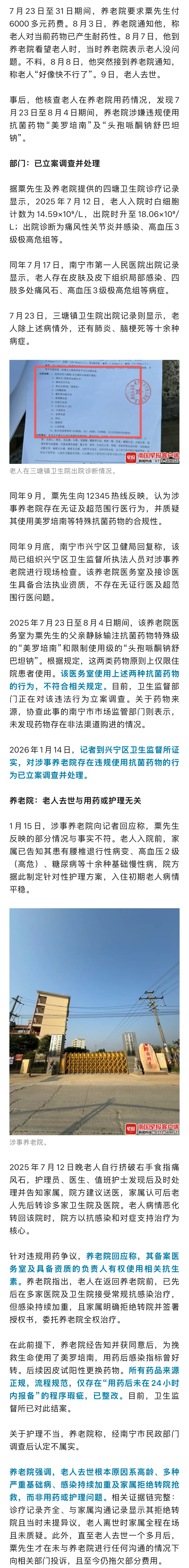 1月15日,涉事养老院回应称,老人去世的根本原因是高龄、多种严重基础病叠加感染持续加重,且家属拒绝转院抢救,与用药或护理无关;其仅存在“用药后未在24小时内报备”的程序瑕疵,现已整改,目前卫生监督部门已结案。
