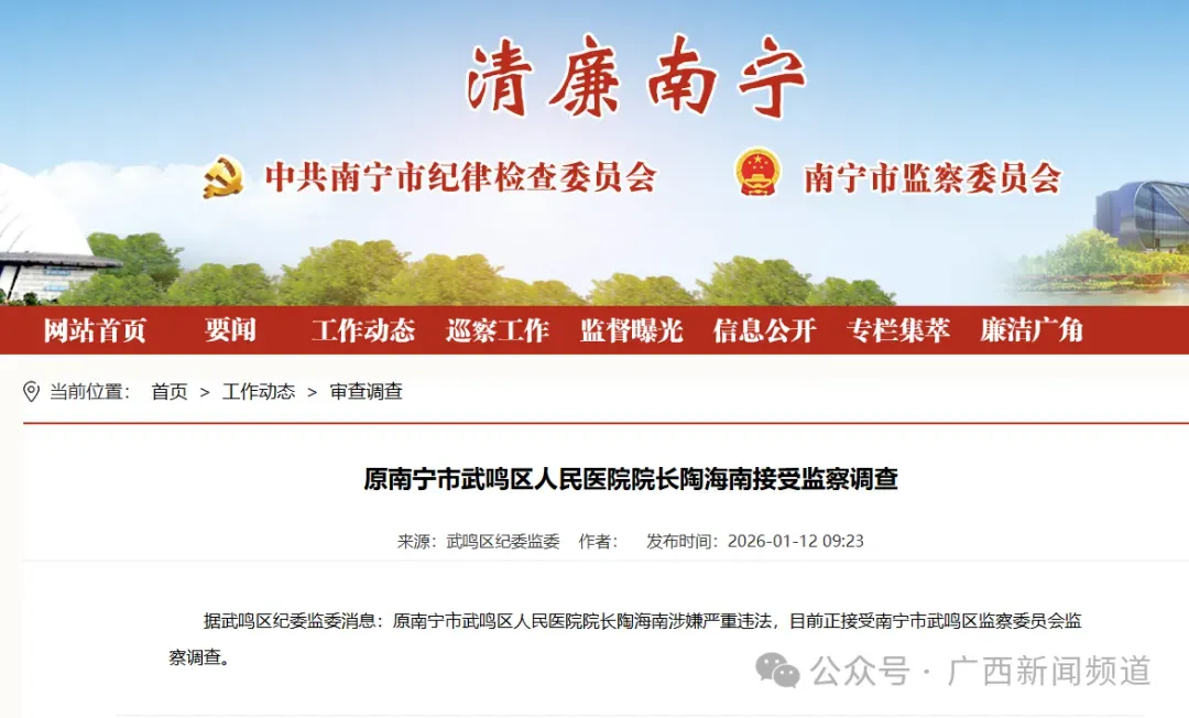 区纪委监委消息:原南宁市武鸣区人民医院院长陶海南涉嫌严重违法,目前正接受南宁市武鸣区监察委员会监察调查。