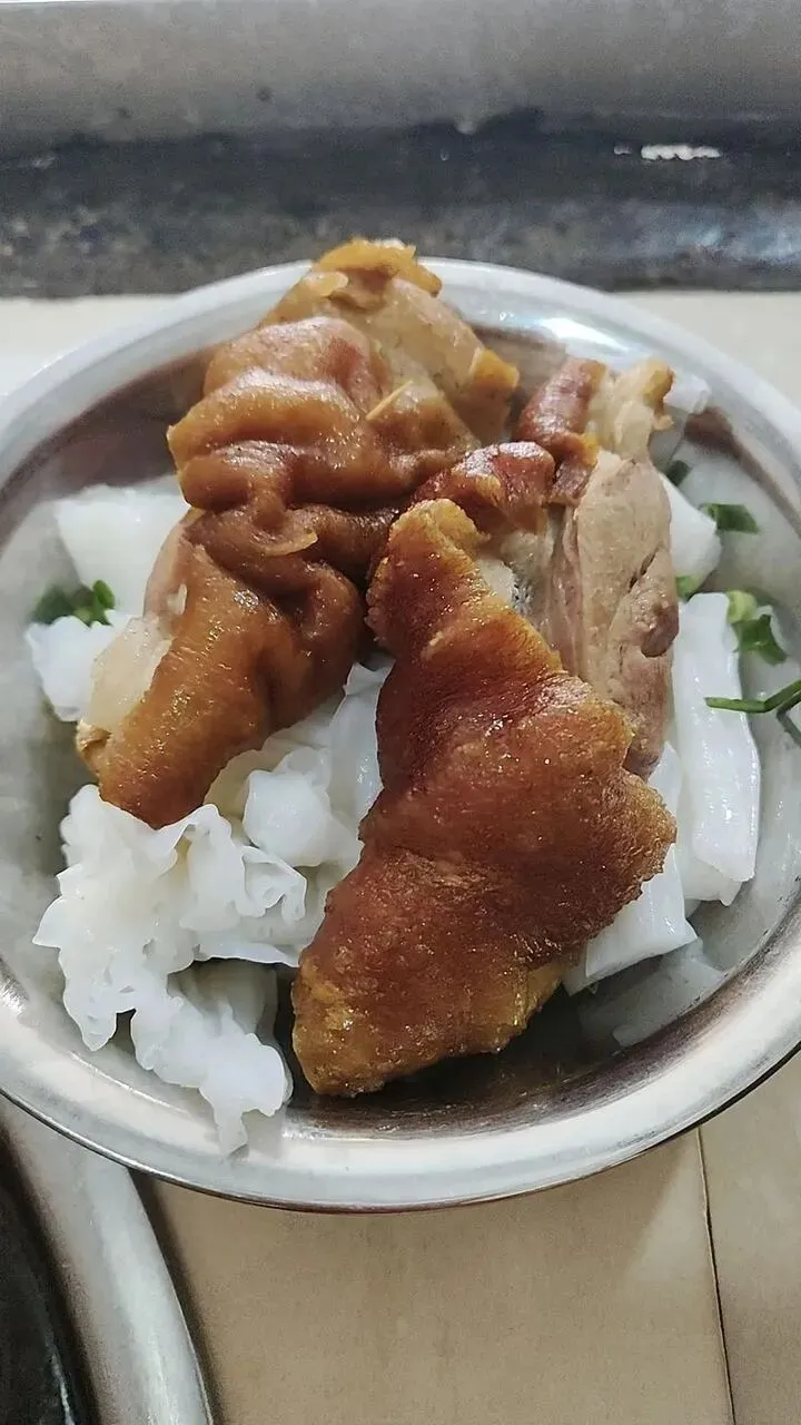 第二个,猪脚粉。这是钦州人的早餐命根子。猪脚炖得烂,筷子一戳就透,皮是弹的,肉是糯的,骨头都能嗦出味。粉是圆粉,滑溜溜的,连汤带粉呼噜往嘴里吸。汤底是大骨熬的,油花漂着,喝一口从喉咙暖到胃里。一碗12块,猪脚给得实在,堆在粉上面冒尖。吃的时候得配酸笋,那酸味一激,困意全消。本地老饕还会加个卤蛋,戳破蛋黄往汤里一搅,香得人直晃脑袋。