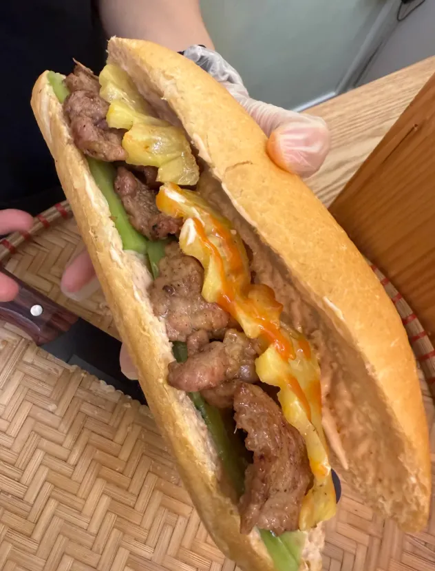 特别推荐尝尝这里的法棍。和硬邦邦的欧式法棍不同,这里的面包体烤得酥脆掉渣,内里却保持着蓬松的空气感。从中间剖开,抹上一层厚厚的肝酱,塞进叉烧、火腿,再铺满酸甜口的萝卜丝和香菜,最后淋上一勺秘制酱汁。一口咬下去,酥、软、咸、鲜、酸在嘴里炸开,口感层次丰富得让人舍不得咽下去。