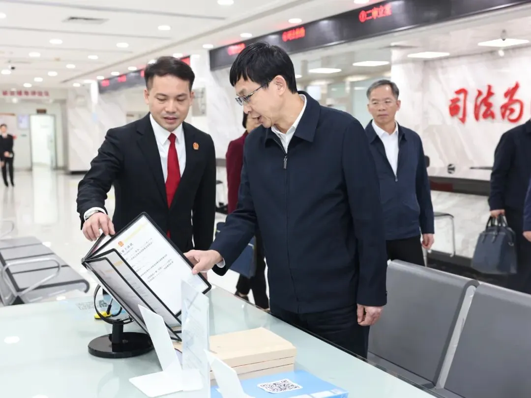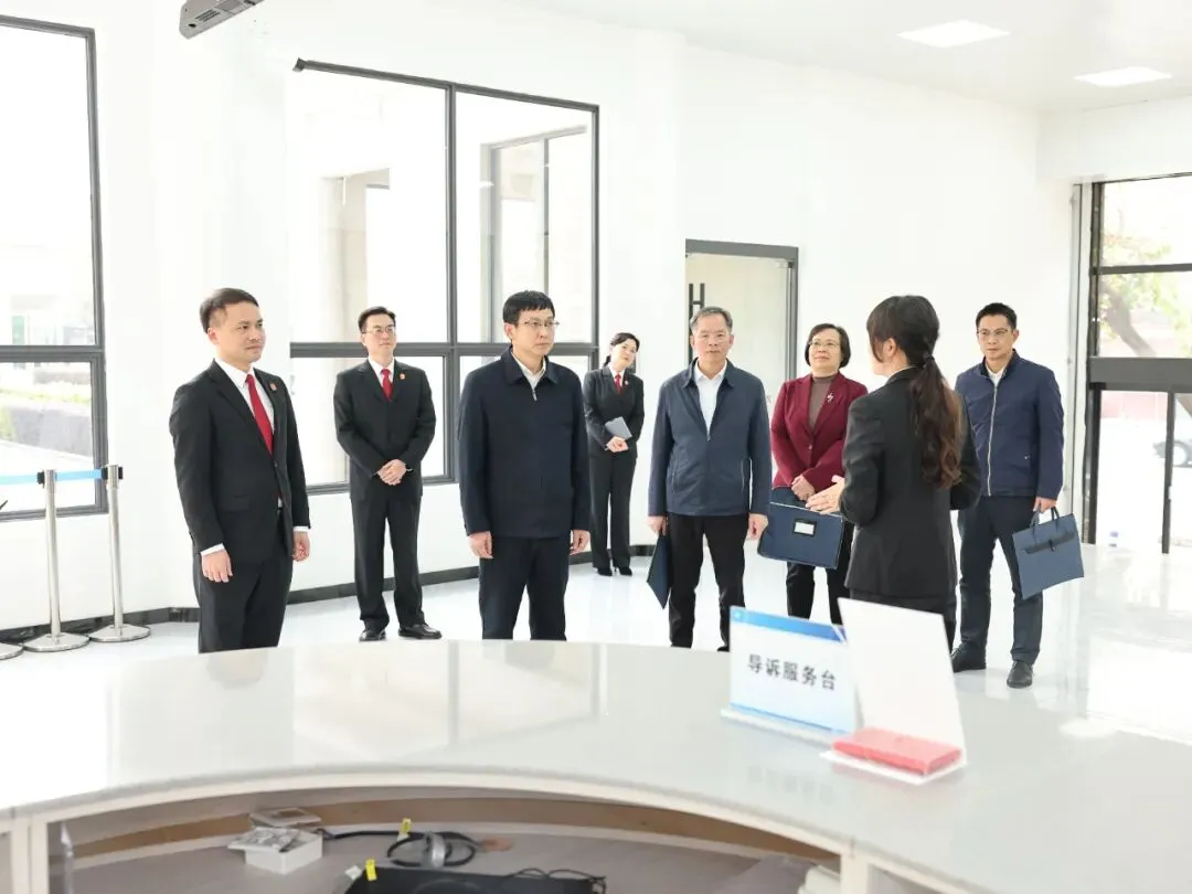 调研组一行先实地走访了市中院24小时自助服务区、安检服务大厅、家事少年审判法庭、诉讼服务中心以及警务指挥中心等场所。通过现场察看、听取讲解、互动交流等方式,详细了解案件受理流程、庭审规范化建设、司法便民服务举措落实等情况。随后召开了座谈会,听取工作情况汇报,并进行交流。