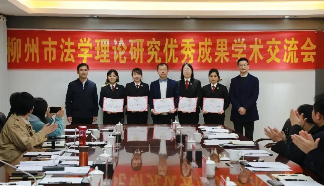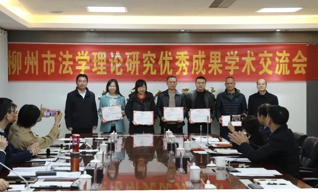 1月16日,在柳州市法学理论研究优秀成果学术交流会现场,与会领导为先进单位、获奖作者代表颁发荣誉证书。(覃嘉鑫 摄)