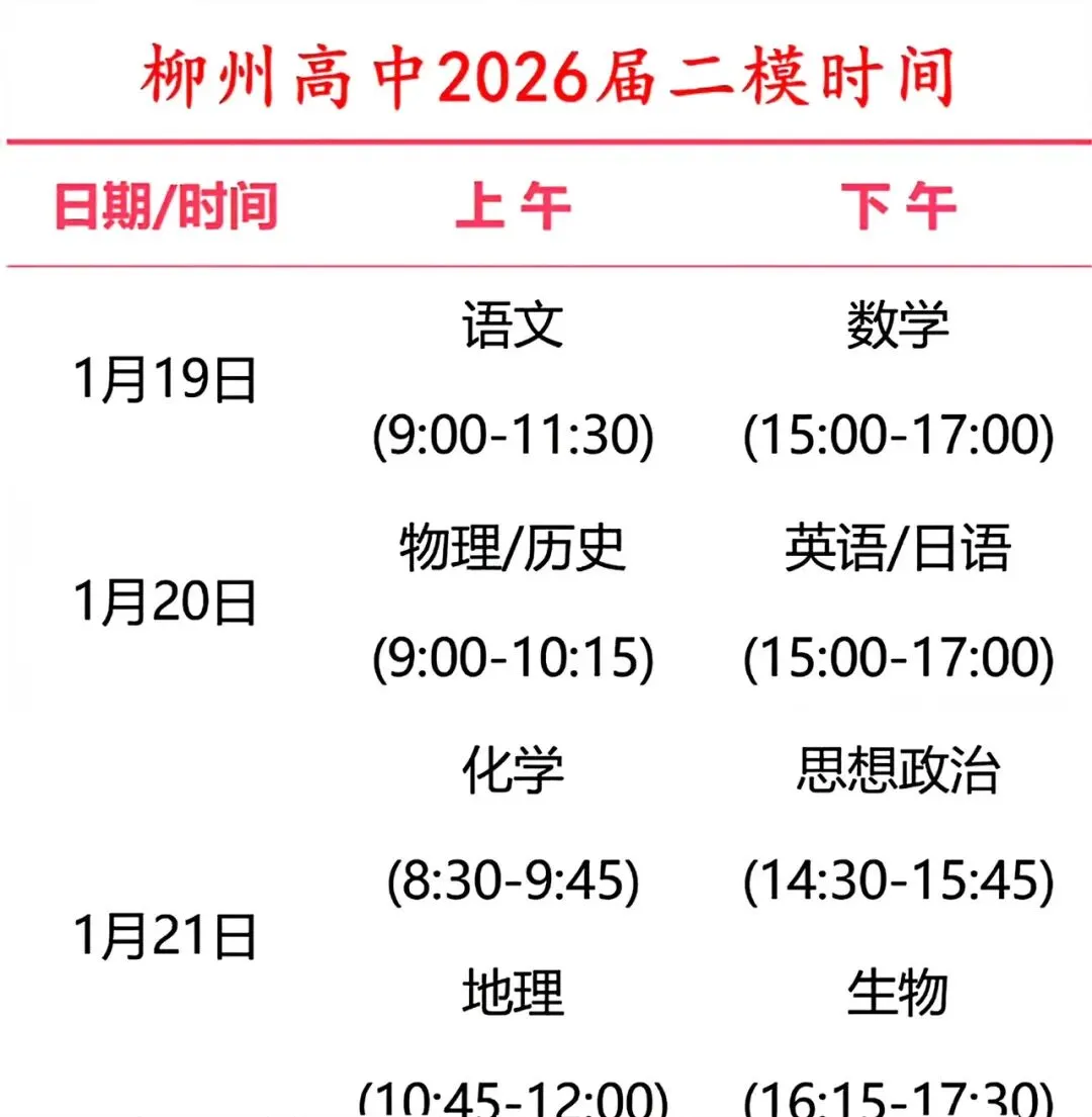 2026届柳州二模安排!汇总了语文、数学、英语、物理、历史、化学、生物、政治、地理九科!