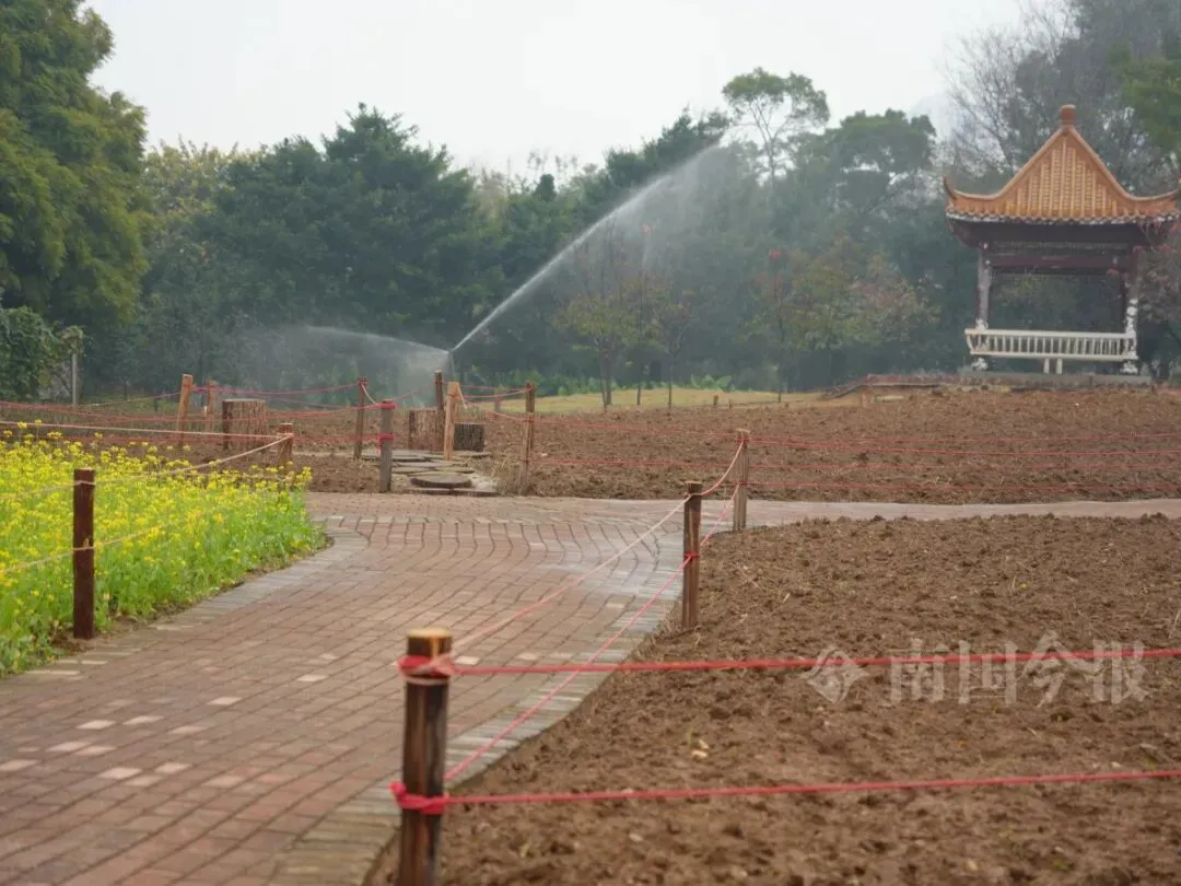 远处,智慧喷淋系统正在给花地浇灌,几名工作人员穿梭其间进行日常管护。记者留意到,这几块花田的油菜花株高参差不齐,旁边还有几块刚翻新的空地。