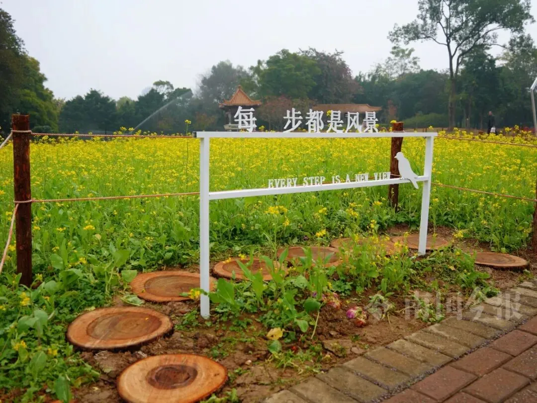 为方便市民游客近距离赏花拍照,园方还利用废弃樟树枝干锯成木桩铺设成径,打造了多个拍照打卡区。公园管理处提醒广大市民游客文明赏花,切勿采摘踩踏。