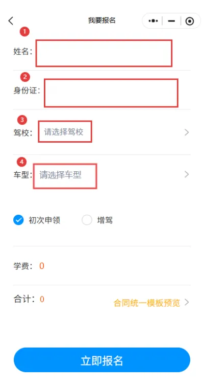 选择“初次申领”或“增驾”后,还可预览统一合同模板,确认无误后点击“立即报名”,整个流程简单快捷!