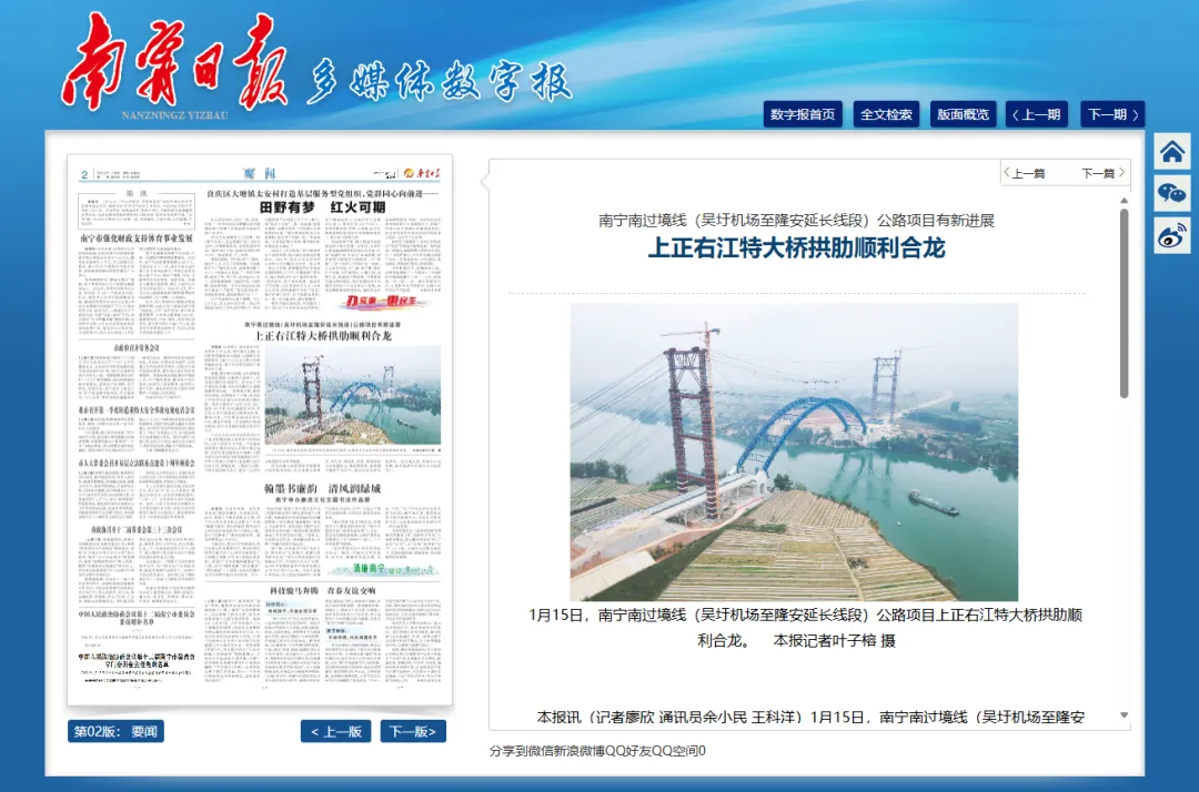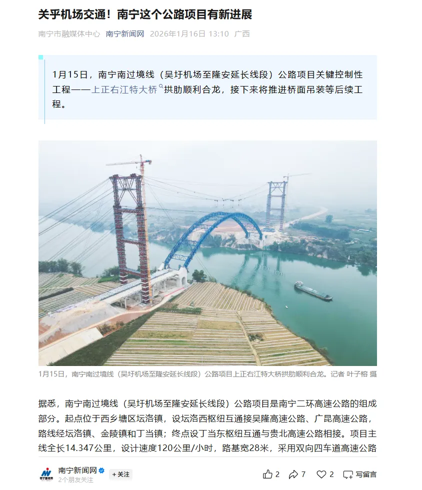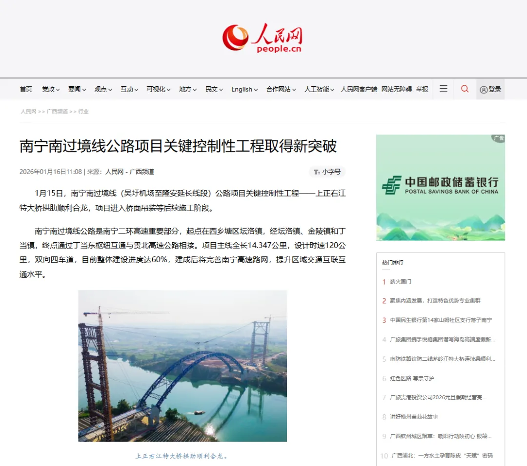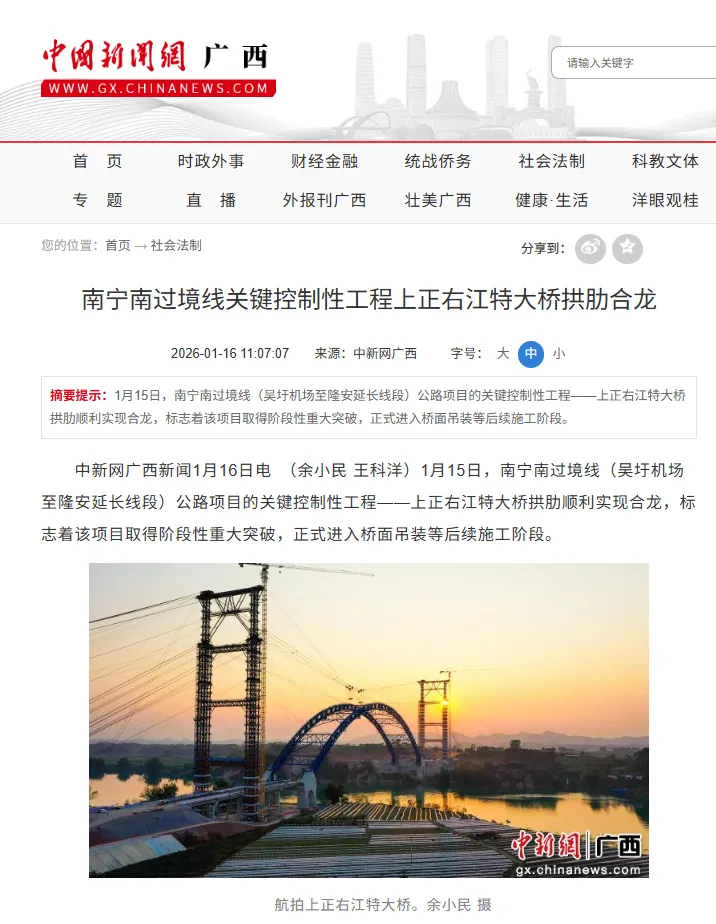 近日,人民网、中国新闻网、南宁日报、南国早报、南宁新闻网、今日头条等多家媒体关注报道公司参建的南宁南过境线关键控制性工程上正右江特大桥拱肋合龙!