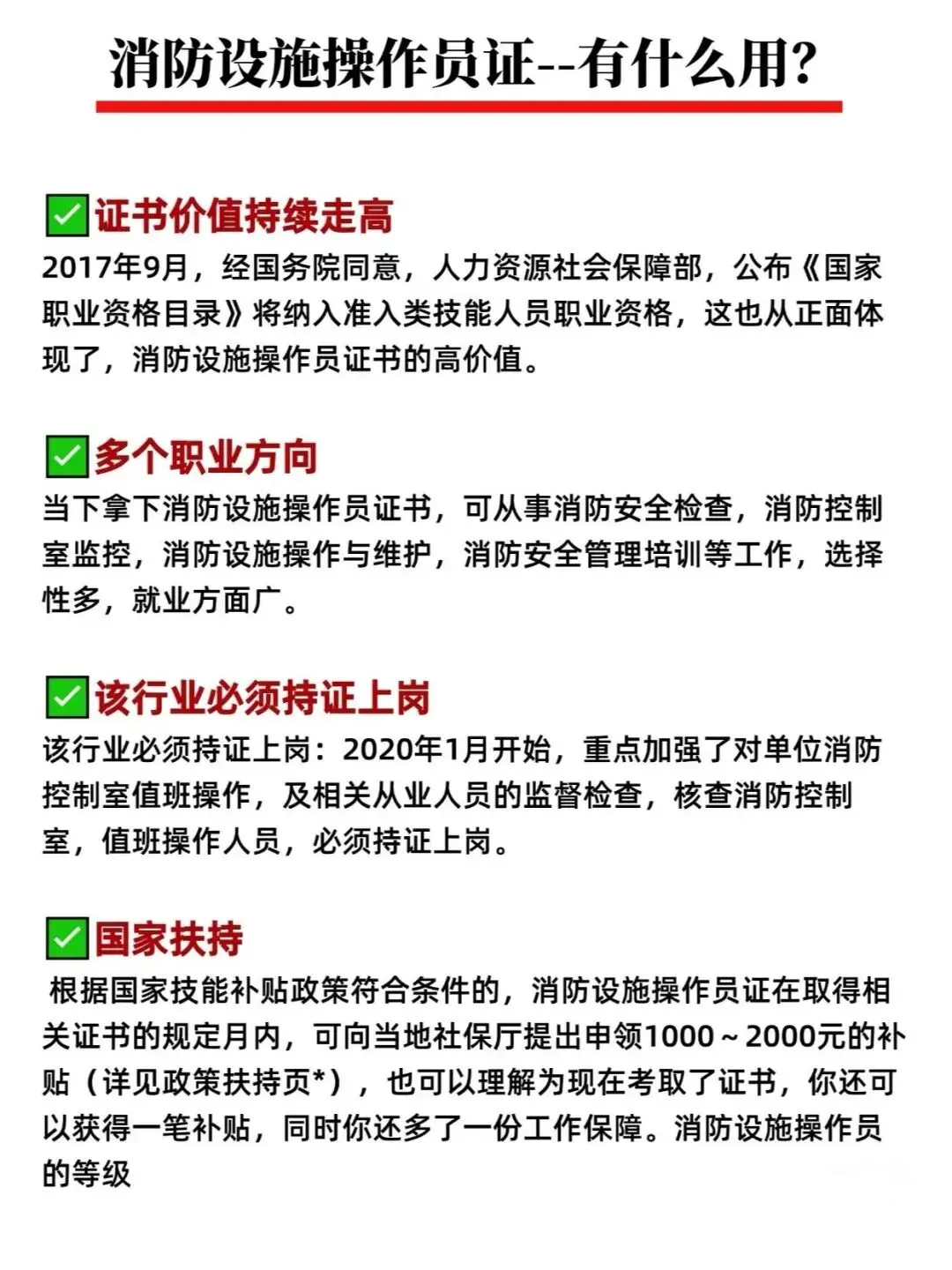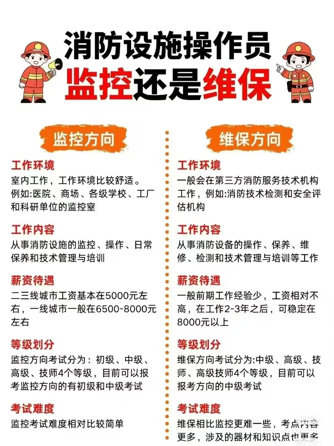 1、消防设施监控操作职业方向:五级/初级工、四级/中级工、三级/高级工、二级/技师