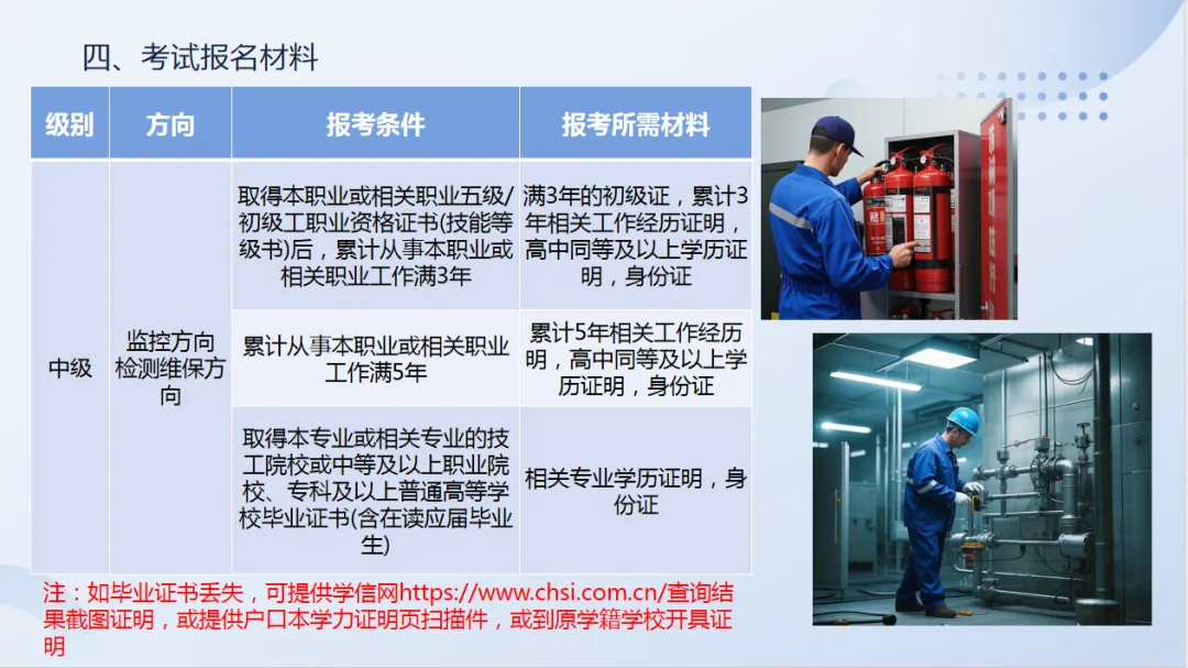 2、消防设施检测维修保养职业方向:四级/中级工、三级/高级工、二级/技师、一级/高级技师