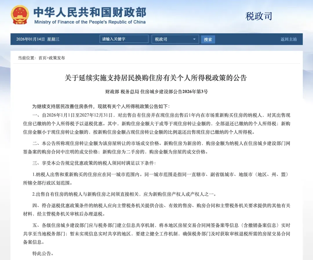 《公告》明确自2026年1月1日至2027年12月31日,对出售自有住房并在现住房出售后1年内在市场重新购买住房的纳税人,对其出售现住房已缴纳的个人所得税予以退税优惠。
