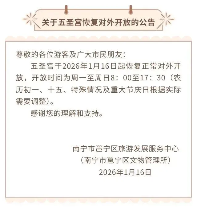 南宁市邕宁区旅游发展服务中心(南宁市邕宁区文物管理所)发布了关于五圣宫恢复对外开放的公告,具体内容如下: