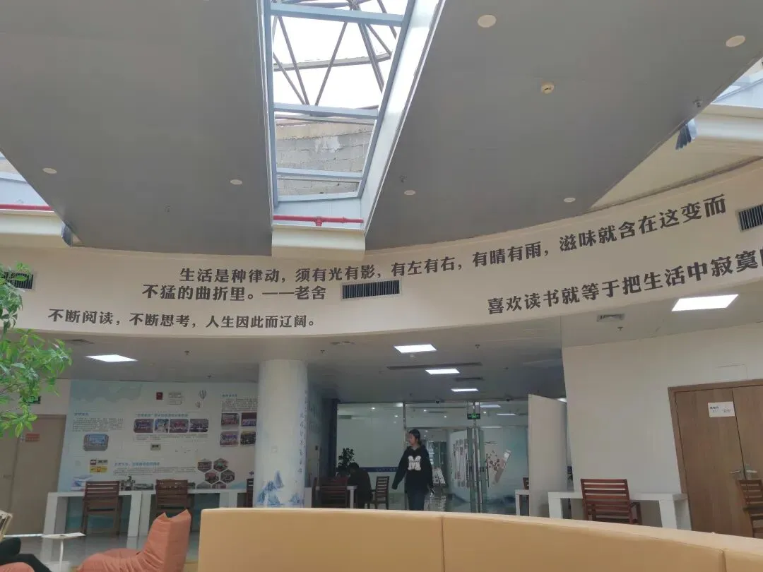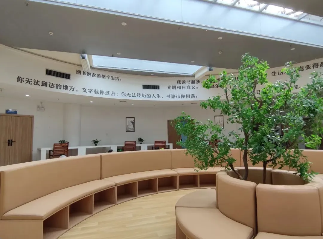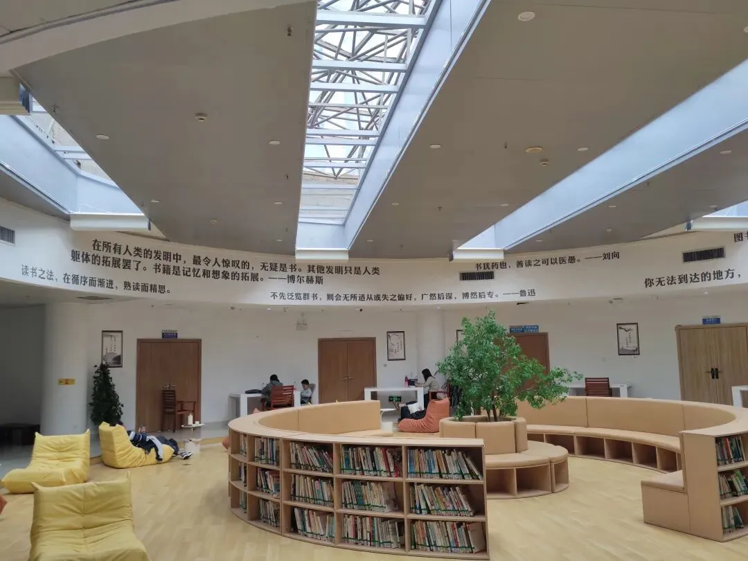 踏入图书馆一楼大厅,首先映入眼帘的不是冷冰冰的服务台和密集的书架,而是一片绿意盎然的休闲区。高大的绿植点缀其间,造型别致的懒人沙发散落各处,墙上精心挑选的读书箴言在光影中静静呼吸。