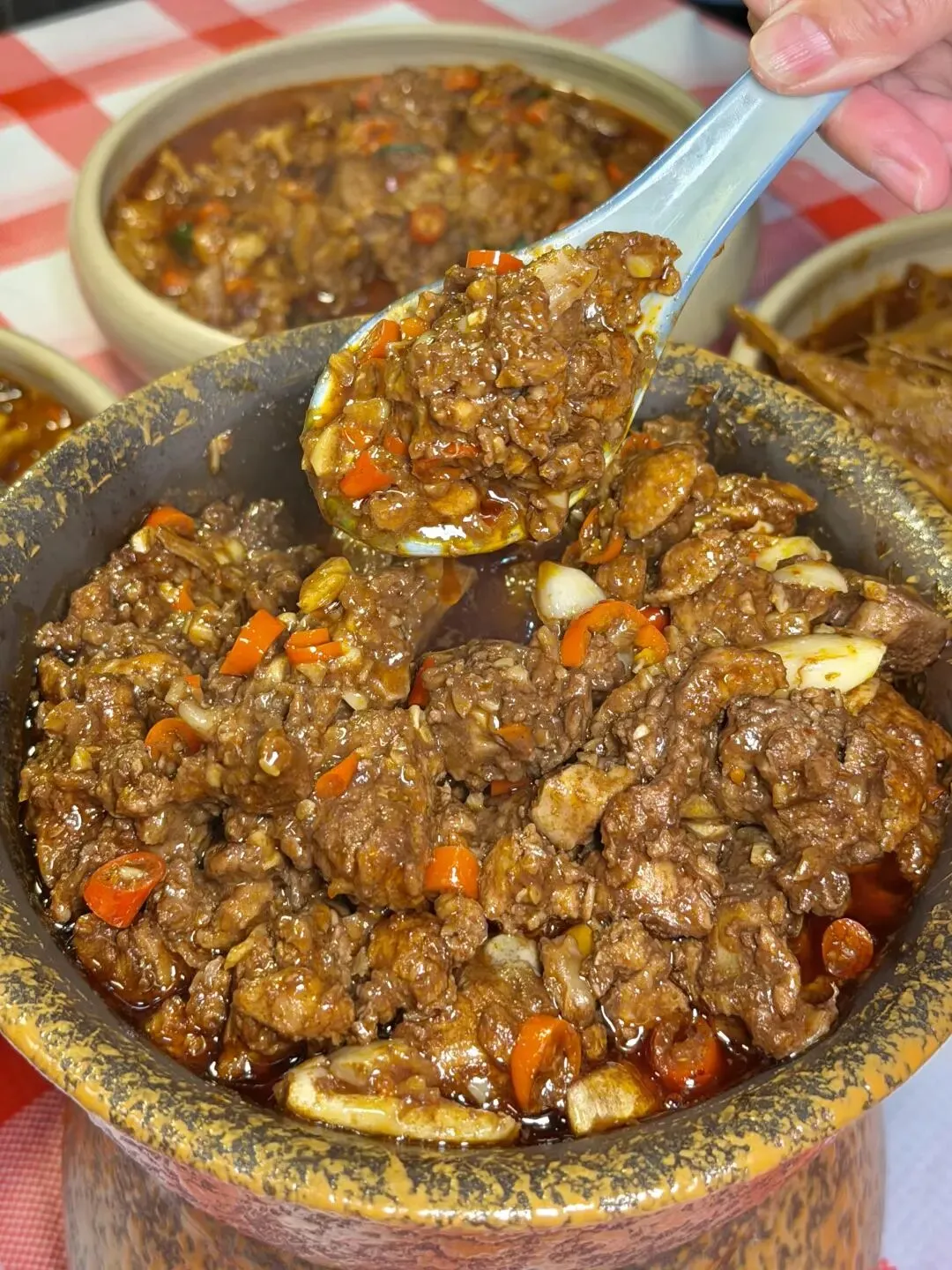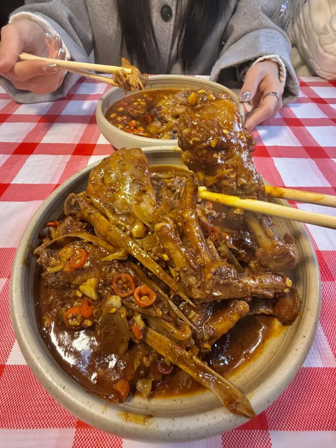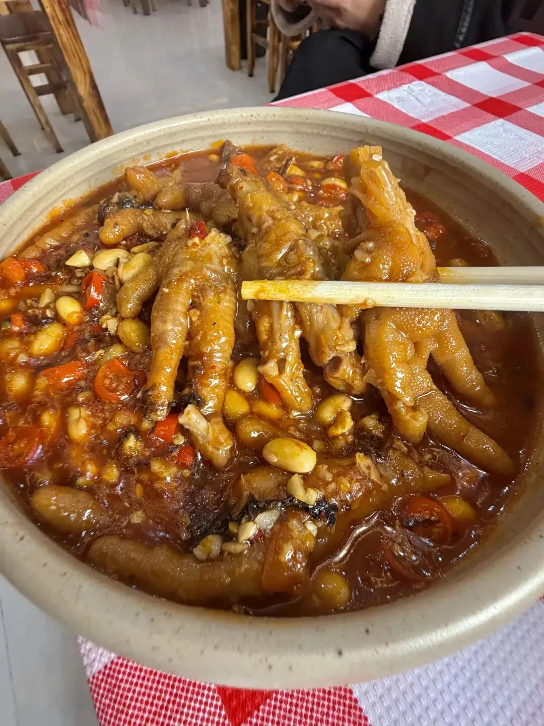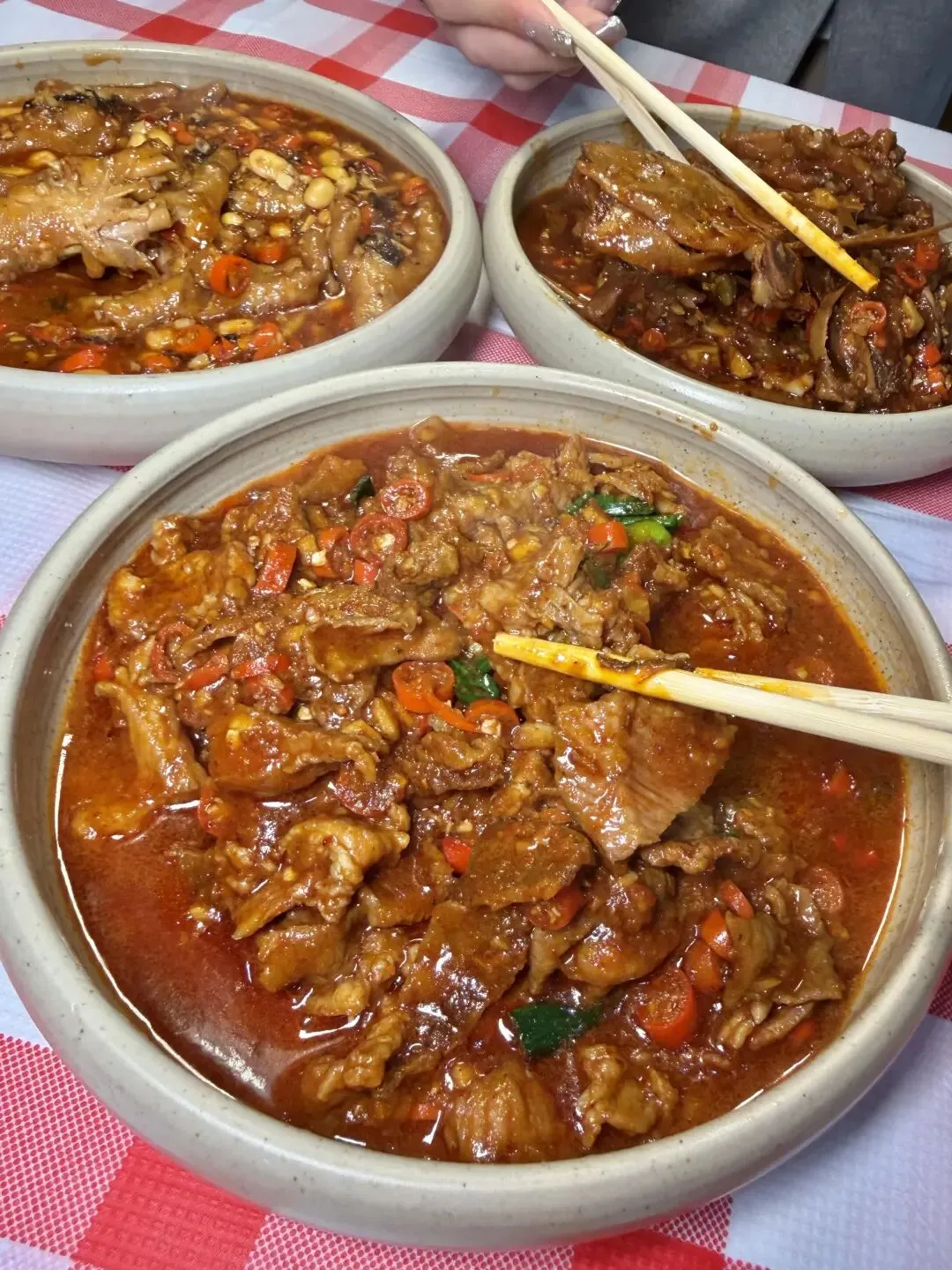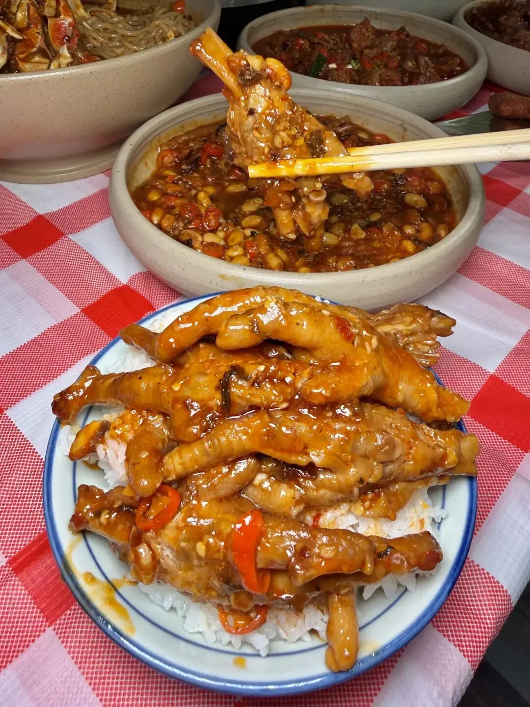 梅干菜辣鸡爪更是下饭神器,鸡爪剪去指甲焯水后,与泡发好的梅干菜一起用冰糖炒糖色焖煮40分钟,炖得软糯脱骨,一抿就化。梅干菜吸满了肉香与卤汁,咸香中带点微甜,连骨头缝里都裹着味儿,啃完手指都要嗦干净,剩下的酱汁用来拌面条更是绝配。