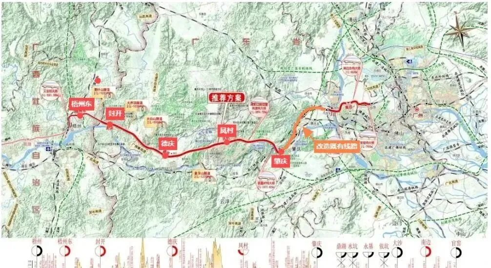 在梧州至广州段中,广东省境内主线全长231公里,投资估算约319亿元,基本沿既有的南广高铁广东段平行布线,是实现梧广间“动货分离”的重要节段。