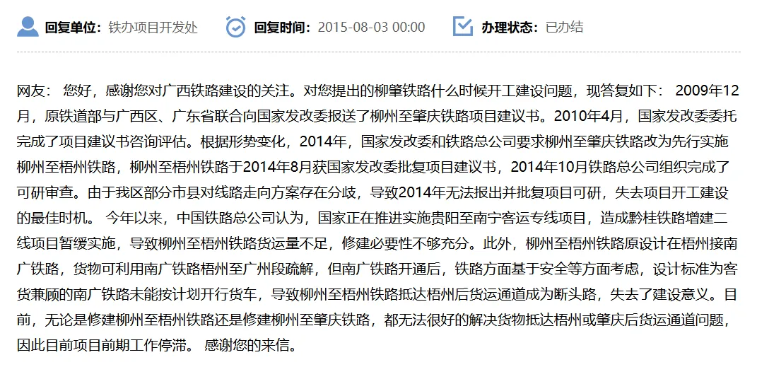 2015年8月广西发改委回复柳肇铁路开工问题
