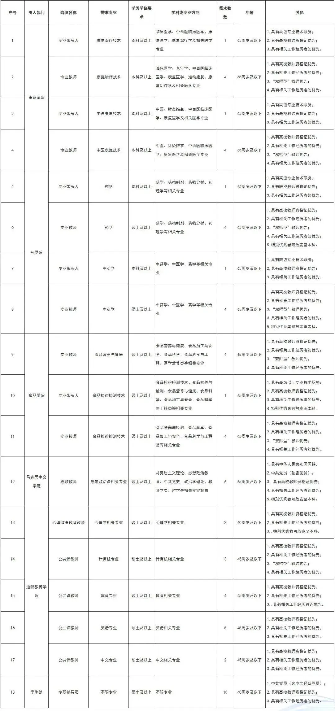 现面向社会公开招聘专业负责人及骨干教师。我们诚邀有志于教育事业的优秀人才加入我们的行列,共同为培养食品药品与大健康产业高素质技术技能人才贡献力量。学院将提供广阔的发展空间和优厚的薪酬待遇,期待与您携手共创美好未来。招聘如下: