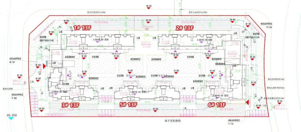 (4)地面商业及流线进行调整,商业根据楼栋位置调整,地面机动车为集非机动车相应调整位置,数量也有变化。车位配比按新规1:1.2(0.2为微型车位)指标进行调整,调整后机动车位共298个,其中地面机动车位37个,地下机动车位261个;非机动车停车位共515辆,其中地面非机动车停车位185辆,地下非机动车停车位为330辆。