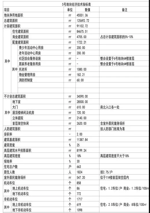 5号地块的变化涉及主要经济技术指标调整,底层架空面积由1000㎡调整为2620㎡,地下室建筑面积由27500㎡调整为28500㎡,屋顶楼梯间及机房建筑面积由250㎡调整为720㎡,总建筑面积、不计容建筑面积均有相应变化。室外居民健身场所有549.6㎡调整为547.2㎡。