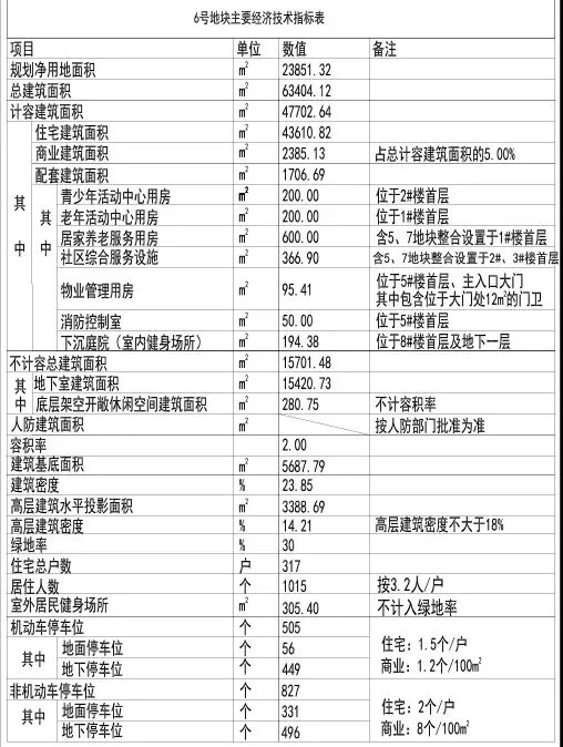 (5)总建筑面积、总计容面积(包括住宅与商业、配套建筑面积)、不计容总建筑面积(包括底层架空、地下室建筑面积)、室外居民健身场所面积等经济技术指标指标均有调整,不计容总建筑面积还增加了屋顶楼梯间及机房面积。