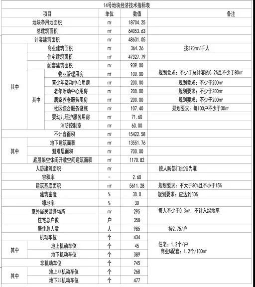 据经济技术指标表,14号地块净用地面积为18704.25㎡(合28.06亩),总建面64053.63㎡,容积率2.6,总户数358户,机动车位434个(其中地上机动车位45个,地下机动车位389个)。