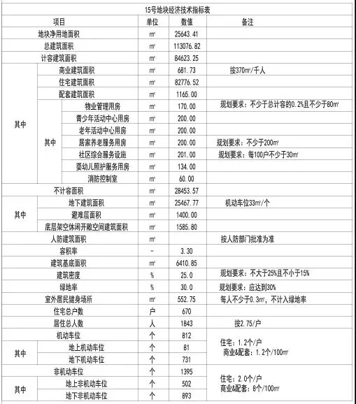 据经济技术指标表,15号地块净用地面积为25643.41㎡(合38.47亩),总建面1130.76.82㎡,容积率3.3,总户数670户,机动车位812个(其中地上机动车位81个,地下机动车位731个)。