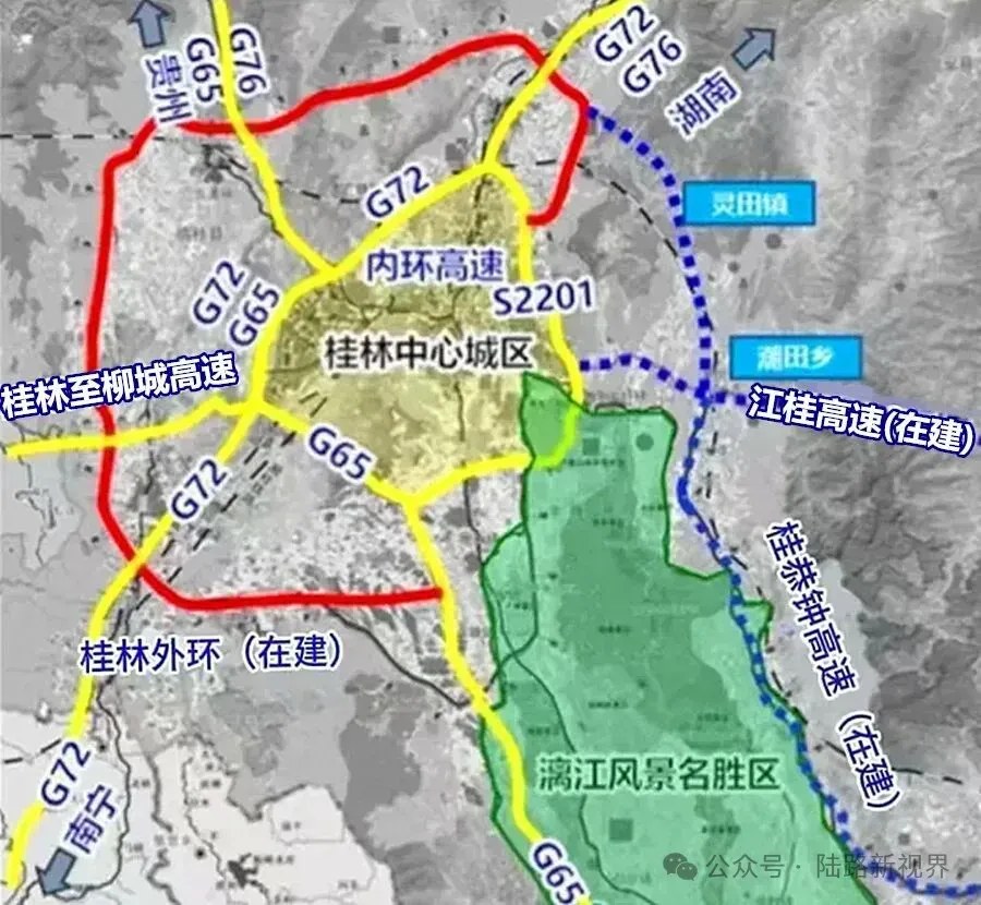 桂林外环高速主线全长约124公里,途经两区两县,共设置13处互通式立交,预计于2028年建成通车。