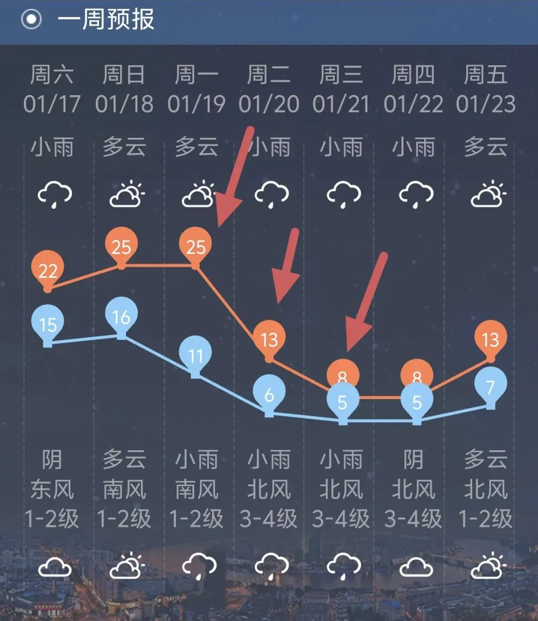寒潮影响下,市区气温将降至5℃左右,各地气温累计下降10~14℃,局地降幅可达16℃以上。其中,北部高寒山区气温为-6~-1℃,其余地区为0~5℃,低温状态将持续至25日前后。后续虽有缓慢回温,但隆冬时节冷暖交替频繁,暂时不会出现大幅回暖。