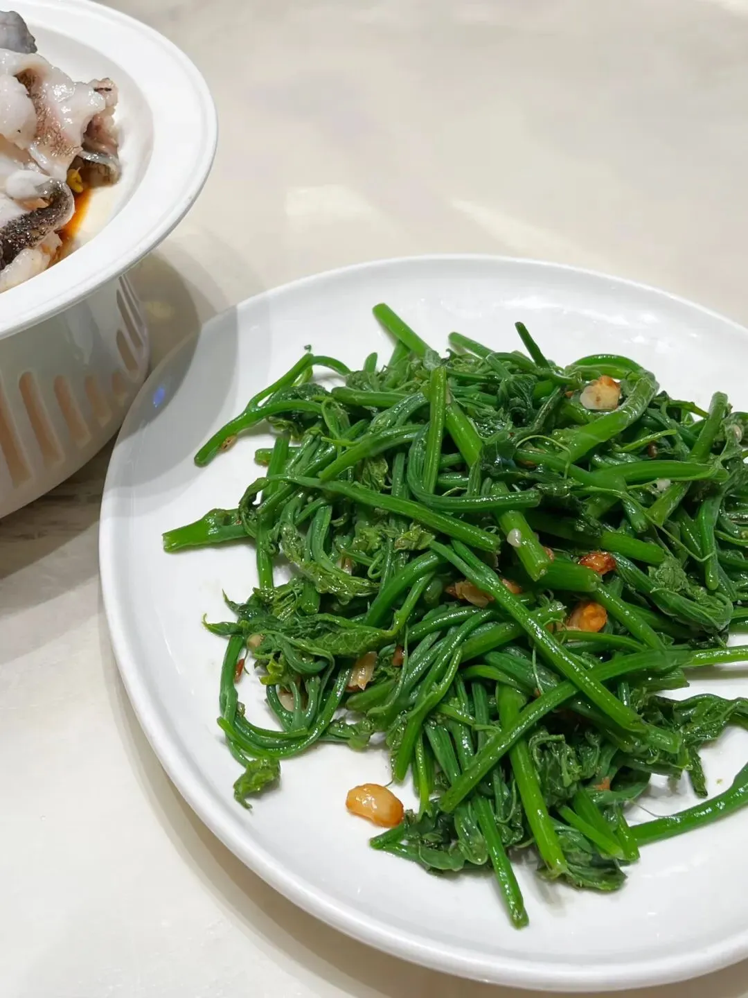为了解腻,还点了一盘猪肉油渣炒佛手瓜苗,他家的佛手瓜苗,也是炒得特别好吃。