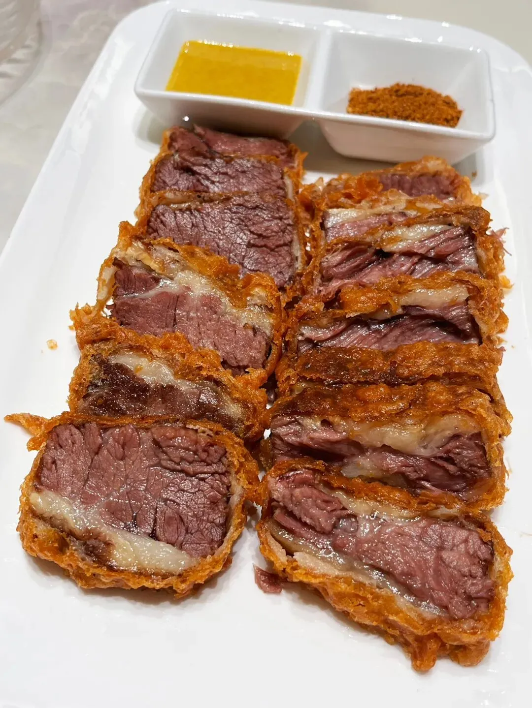 前段时间,一个朋友发了脆皮牛肉整齐摆放在不锈钢盘里的图片(不是下面这张图),说想去吃,在埌西那边。我还以为是埌西夜市哪家路边的小吃,这么舍得下血本。