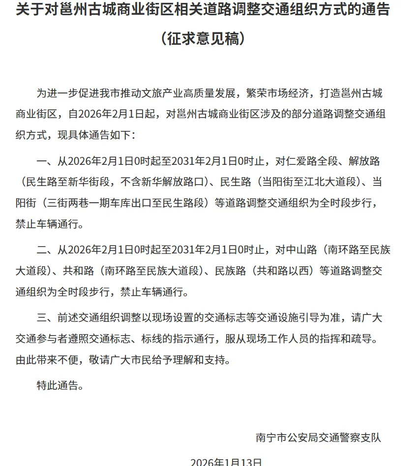 1月13日,南宁市公安局交通警察支队发布了《关于对邕州古城商业街区相关道路调整交通组织方式的通告》(征求意见稿),计划从2026年2月1日零时起至2031年2月1日零时止,拟对仁爱路全段,解放路、民生路、当阳街、中山路、共和路、民族路6条道路的部分路段实行全时段步行。
