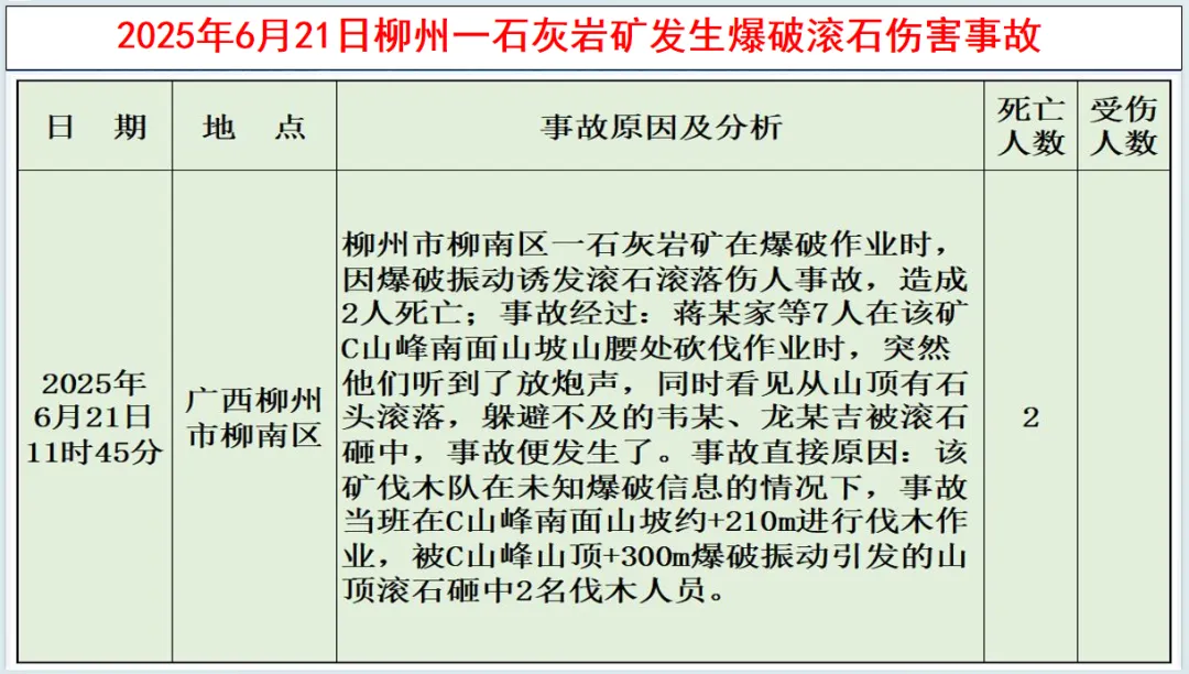 2025年6月21日,柳州市柳南区一石灰岩矿发生一起爆破滚石伤害事故,造成2人死亡,直接经济损失约217万元。