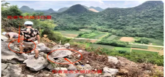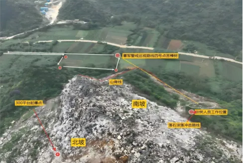 爆破振动通用计算,事发地点位于山体背面高程为 210m,从通报中相关信息,导致事发地的滚石可能来源于正上方310m顶峰边坡,对可能产生滚落的310m高程边坡区域离300、255、240平台爆区的距离大概约为 45m、203m、269m;300 平台爆区最大单段药量 Q 为 150kg;255平台爆区最大单段药量Q为 352.5kg,240平台爆区最大单段药量 Q 为 469.0kg,根据爆破质点振动计算公式:V=K(Q1/3/R)a(岩性为中硬石灰岩,K=150-250,α=1.5-1.8,按最不利于爆破振动的验算发现,取值 K=200,α=1.5),分别计算可得质点振动速度 V1=8.11cm/s、V2=1.25cm/s、V3=0.98cm/s。