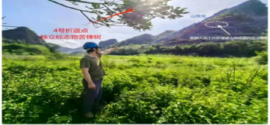 C山峰后背山林地警戒责任人覃某和梁某安,覃某负责4号警戒点,梁某安负责3号警戒点。覃某开车至后山4号警戒点和3号警戒点交界处停车,两人下车,梁某安走至矿区山脚下,由西向东警戒巡查;覃某在下车点由东向西在一条林中小路警戒巡查至苦楝树位置,在对其负责的4号警戒点路线尚有约110米未巡查警戒完毕时,即用对讲机向爆破队长(实际下令起爆指挥员)覃某界回复四号线巡查线路已完毕、安全。导致在4号警戒点警戒范围内的7名伐木人员,未能被清离,且在未知爆破的情况下仍在爆破警戒范围内进行砍伐作业。覃某负责的4号警戒巡查的行进路线的勘查图、航拍图、苦楝树位置图、警戒巡查终点示意图分别详见图1、图2、图3、图4。
