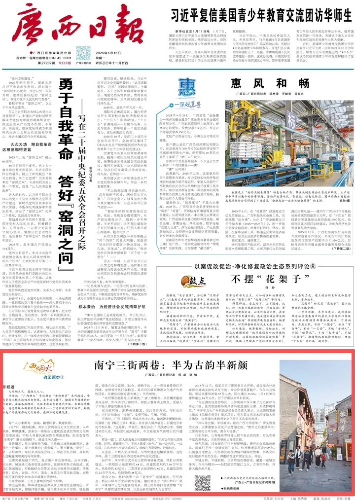 1月7日,暖阳轻拂。南宁三街两巷历史文化街区里,人声鼎沸,熙熙攘攘。游客在一栋栋由古建筑改造成的传统文化展示馆里流连;年轻人身着民族服饰在角落旅拍;白发苍苍的“老南宁”静坐在骑楼下,凝望往来人潮……