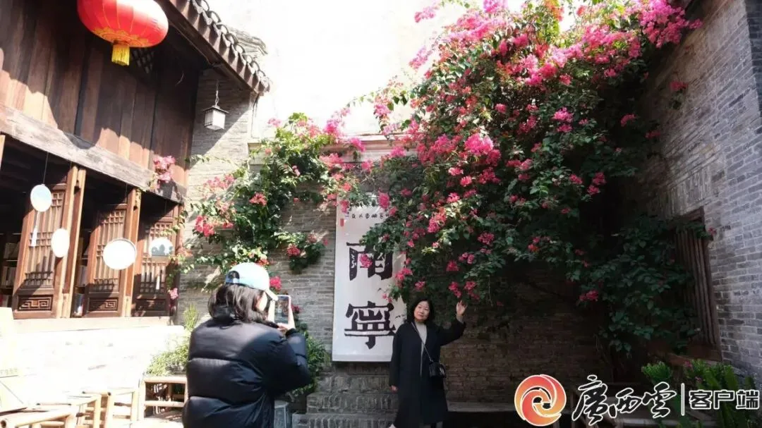 青砖黛瓦,马头墙翘角飞檐。三角梅从墙角蜿蜒而出,泼洒出一片紫红。墙上悬着的白底条幅上,墨书繁体“南宁”二字,古朴淡雅。年轻女孩闲坐台阶上,举起手机自拍,身影嵌入这幅意境唯美的岭南画卷。
