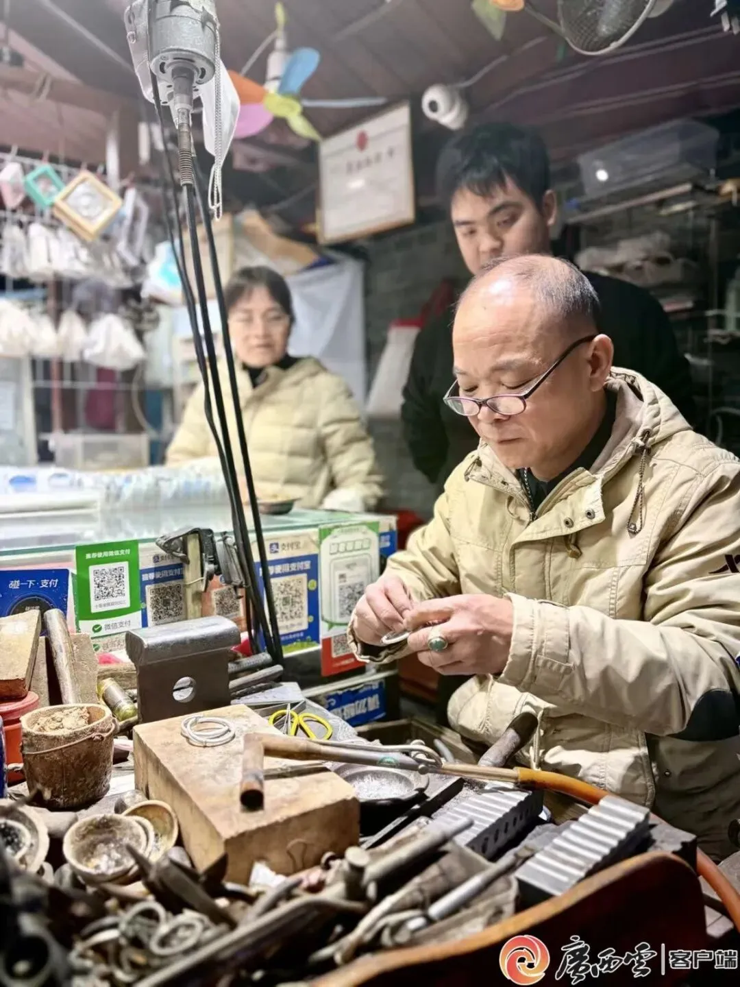 穿过金狮巷,阵阵清脆敲击声从唐上靖的打金铺传出。有顾客专程而来,要锻打银手镯,留作孩子的岁月信物。锤起锤落,银条在指尖延展、贴合。娴熟手法,让一旁孩童看得目不转睛。金狮巷传统打金技艺,是自治区级非物质文化遗产代表性项目,在磨出凹痕的老木案上,代代相传。