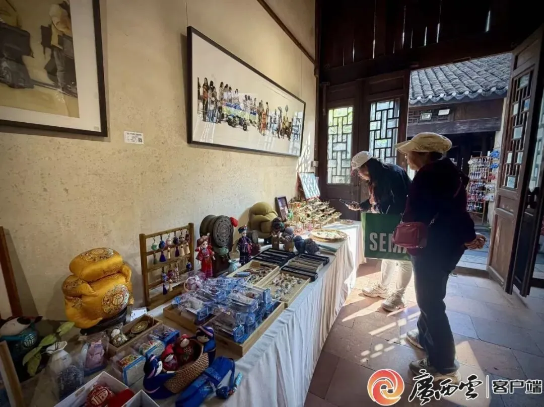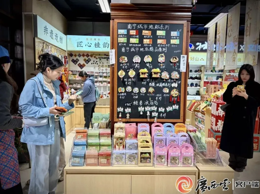 被壮锦、铜鼓等元素创意文创商品吸引,许多游客停下脚步,细心挑选一份“能带走的广西记忆”。