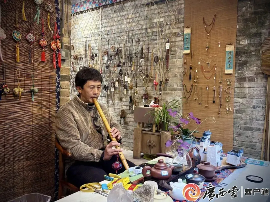 不远处,广西(国际)纸本艺术中心里,幽远箫音缓缓流淌。何国斌一曲《梅花三弄》奏罢,总有游人循声驻足,打量他手中的竹制乐器。“这是箫,声音沉,像在讲古。”他笑着分享。围拢过来的人里,年轻面孔越来越多,不乏被东方气韵吸引的外国友人。