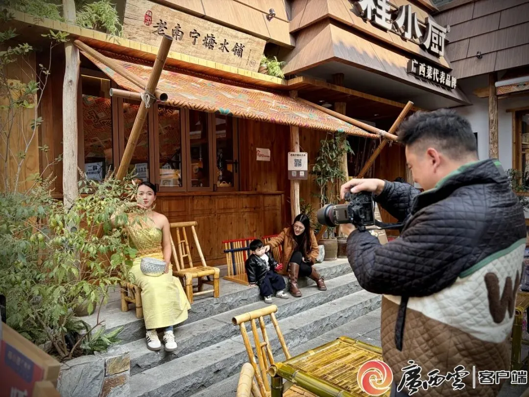 游客在院落里的“南宁”条幅边拍照打卡。