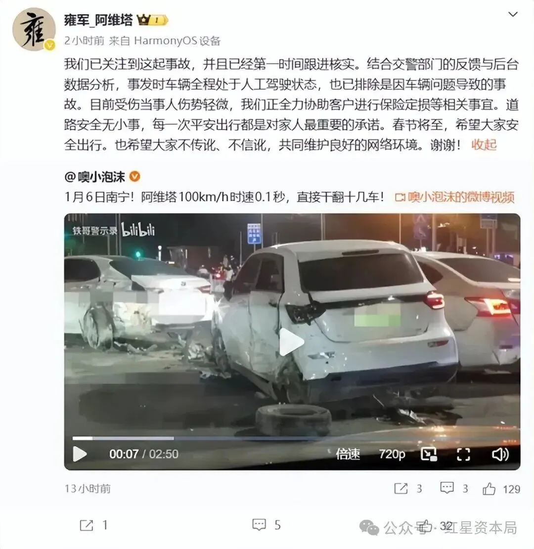 1月6日,一辆阿维塔07在南宁因超速驾驶连续与15辆车发生碰撞,当地交警已做现场调查处理,并出具事故认定书,明确事故原因为驾驶员导致。阿维塔称,根据对用户授权的车辆数据进行分析,结果表明:事故发生前和事故发生时,车辆始终处于【NCA_STANDBY】状态,即辅助驾驶功能未激活。碰撞发生后,安全气囊等正常打开。事故发生后,当事用户本人确认,其从未接受过媒体采访。自1月13日公司首次公开说明情况后,仍有部分媒体在未经任何核实的情况下,持续发布“肇事司机称驾驶辅助系统失控”等完全背离事实的报道,进行恶意剪辑与传播,严重侵害我司品牌声誉。