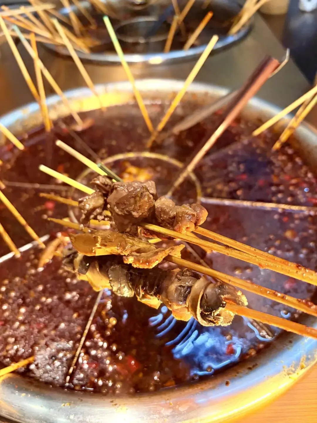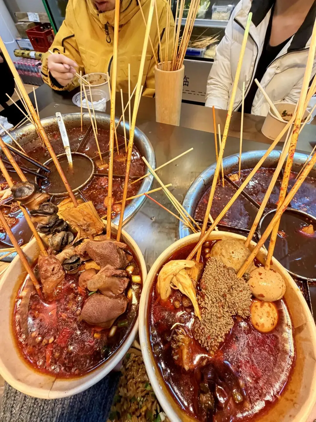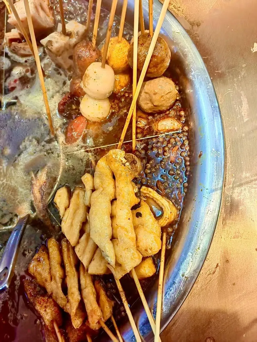 最让人着迷的是“数签自由”的快乐!冷藏柜里的串串分门别类码得整齐,按颜色区分价格,白签1元、蓝签2元,明码标价杜绝“麻辣烫刺客”,拿串时完全不用手软。荤串区藏着湖南麻辣烫的精髓:手工穿制的香菜牛肉串,牛肉鲜嫩裹着香菜的清香;湘西烟熏腊肉串,肥瘦相间带着独特的烟火气;还有提前卤制的虎皮鸡爪,软糯到一抿脱骨,在汤里涮煮后吸满汤汁,卤香与辣香双重暴击。素串区更是水灵,油麦菜、娃娃菜带着清晨的露水,木耳、海带结爽脆饱满,连柳州人爱的油豆腐、炸腐皮都安排得明明白白,每日新鲜采购,绝无隔夜食材。
