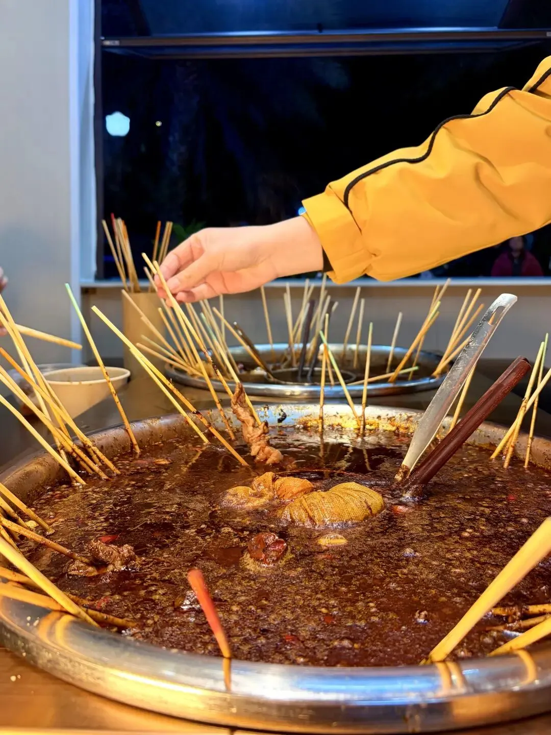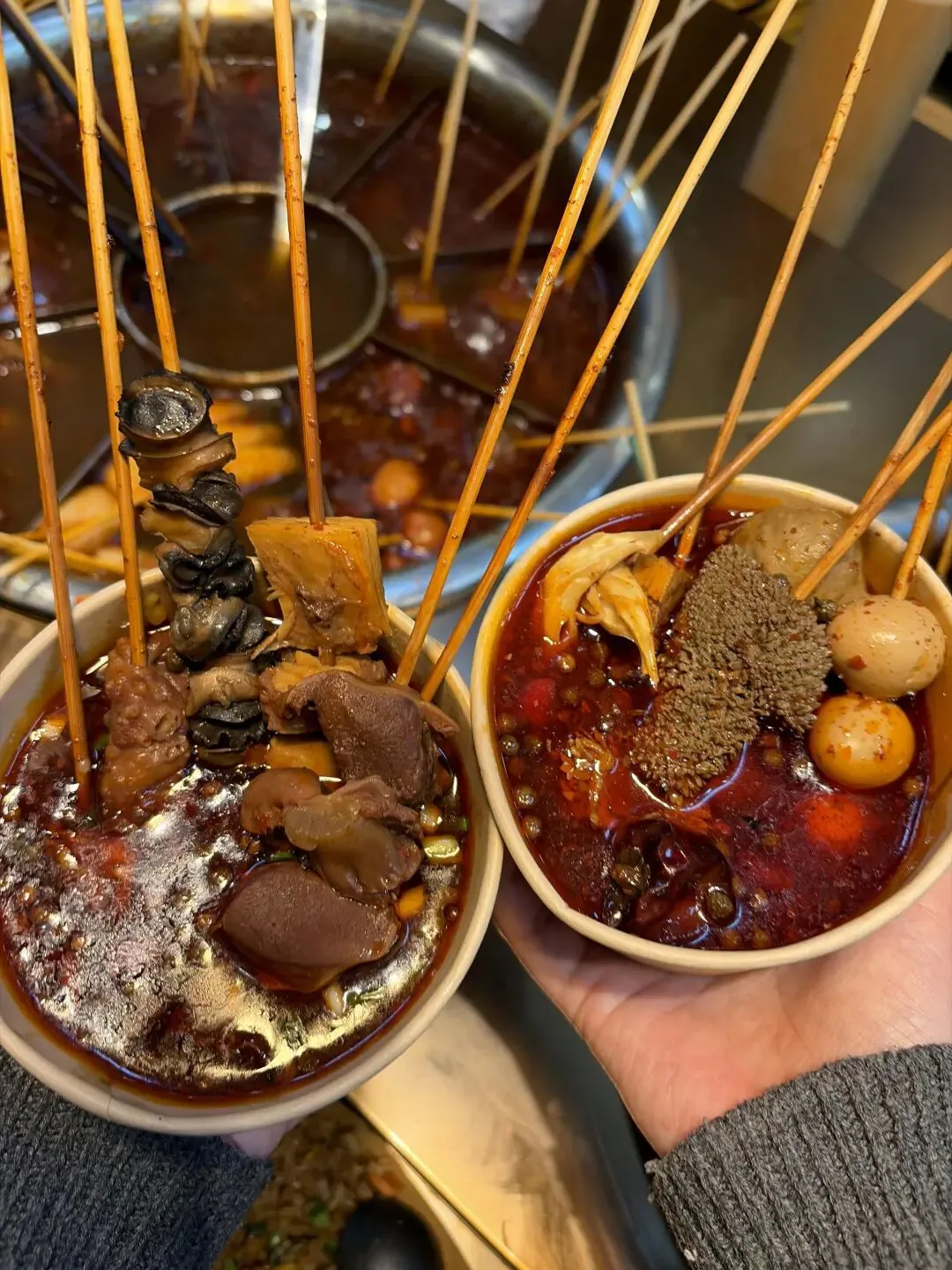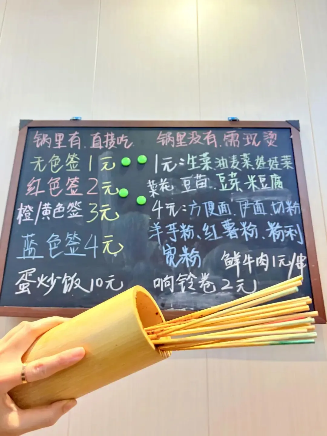 最让人着迷的是“数签自由”的快乐!冷藏柜里的串串分门别类码得整齐,按颜色区分价格,白签1元、蓝签2元,明码标价杜绝“麻辣烫刺客”,拿串时完全不用手软。荤串区藏着湖南麻辣烫的精髓:手工穿制的香菜牛肉串,牛肉鲜嫩裹着香菜的清香;湘西烟熏腊肉串,肥瘦相间带着独特的烟火气;还有提前卤制的虎皮鸡爪,软糯到一抿脱骨,在汤里涮煮后吸满汤汁,卤香与辣香双重暴击。素串区更是水灵,油麦菜、娃娃菜带着清晨的露水,木耳、海带结爽脆饱满,连柳州人爱的油豆腐、炸腐皮都安排得明明白白,每日新鲜采购,绝无隔夜食材。