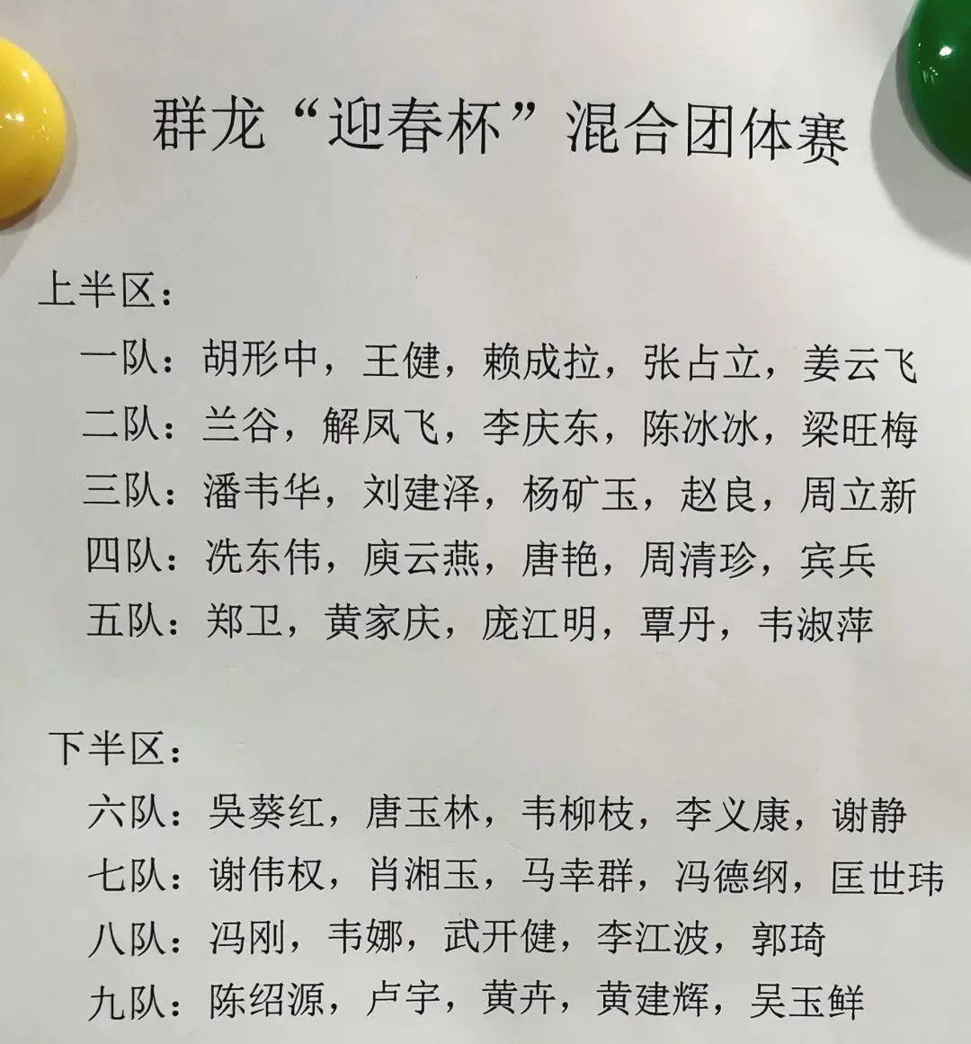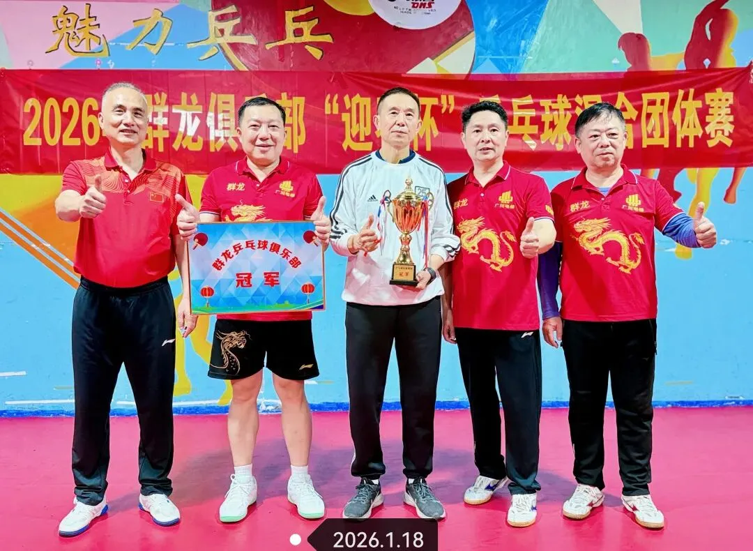 2026年1月18日,柳州市群龙乒乓球俱乐部,在柳州昌威乒乓球馆,举办2026年群龙俱乐部“迎春杯”混合团体赛,比赛共有9支队伍45人参加。最终一队获得冠军。