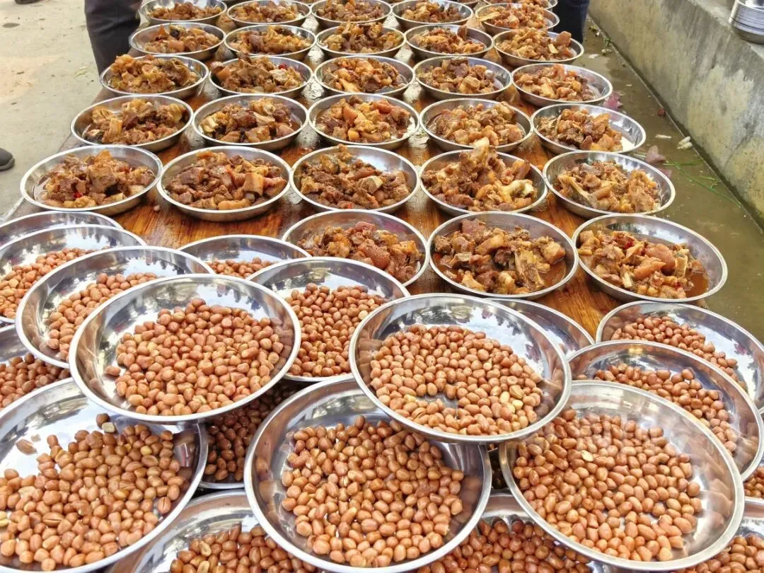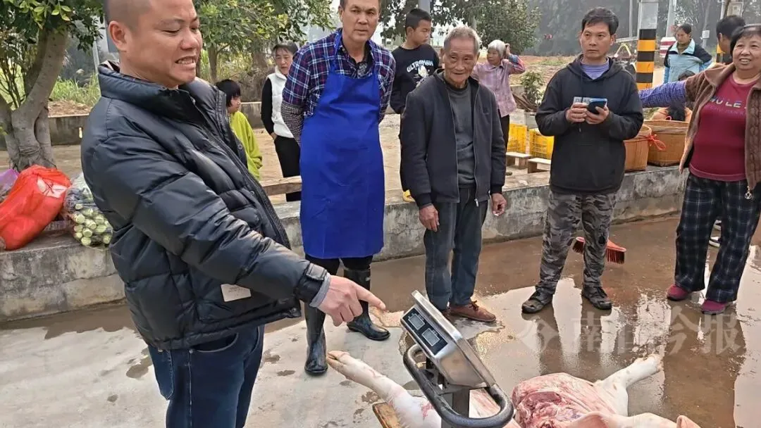 村民吴爱昌介绍,村里逢年过节虽有办杀猪宴的传统,但规模如此之大还是头一回。为了让乡亲们吃得尽兴,黄德信等三人牵头筹款上万元,特地挑了一头村民自养一年多、净重368斤的土猪;村民们又共同商议定下12道特色菜,列好食材清单,分工采购。