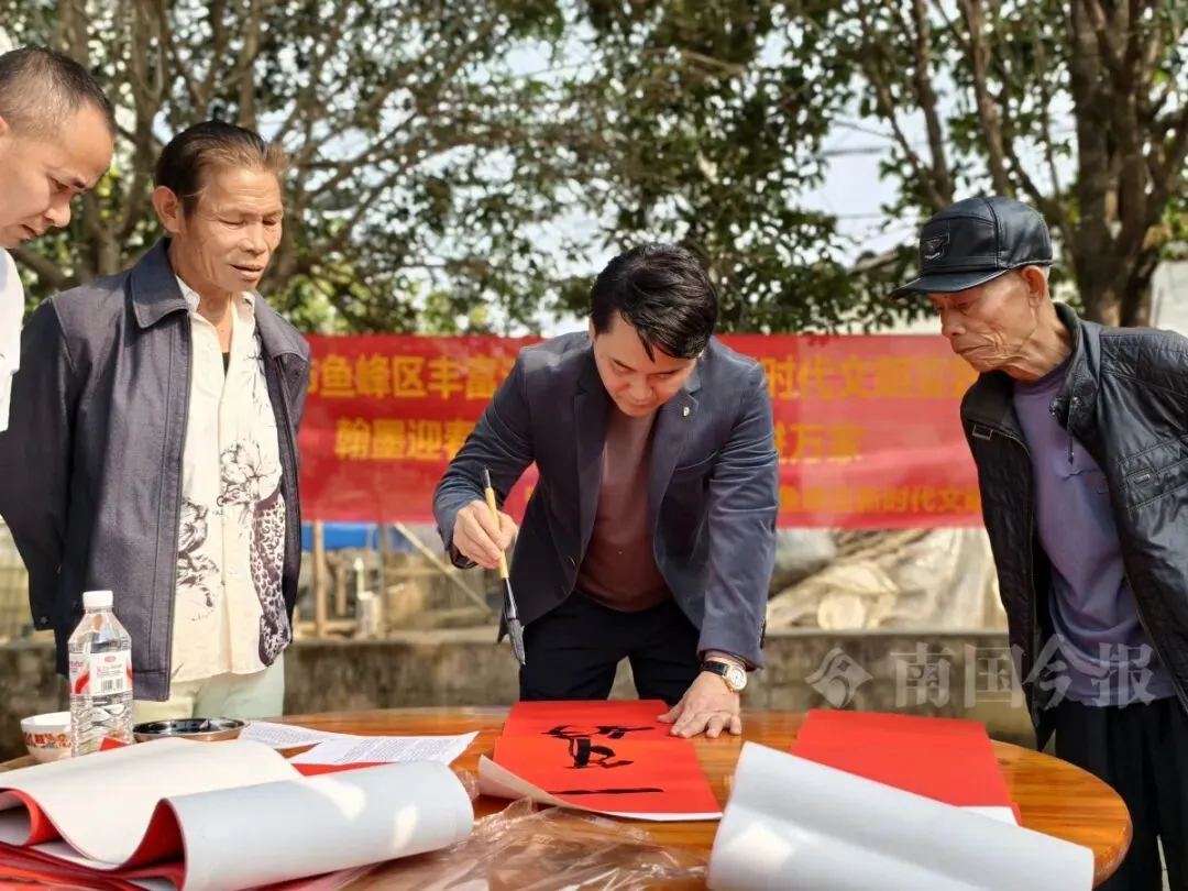 备餐间隙,柳州市文联书法家亲临现场,挥毫泼墨,书下一幅幅春联:“福满家园添喜气,春回大地展宏图”“邻里和睦添福寿,乡村振兴谱新篇”……一幅幅饱含祝福的春联,为这场民俗盛宴增添了浓厚的文化气息;村民们争相领取,脸上洋溢着幸福笑容。