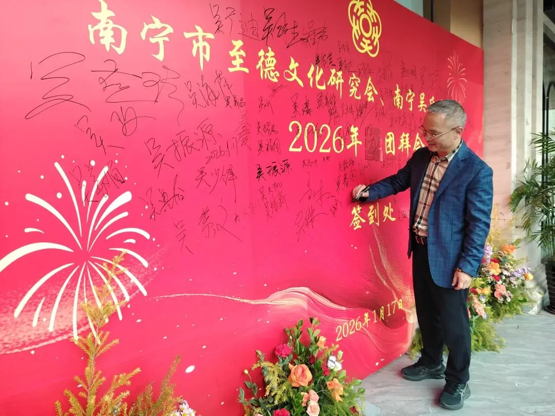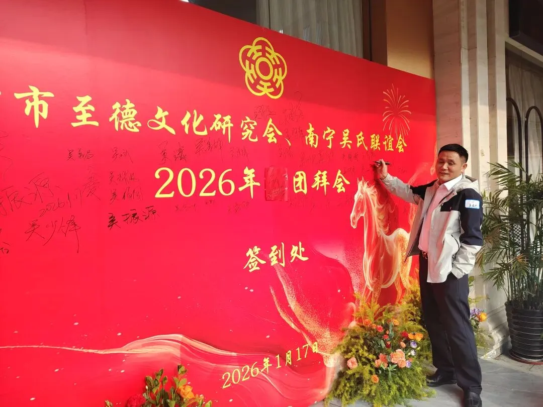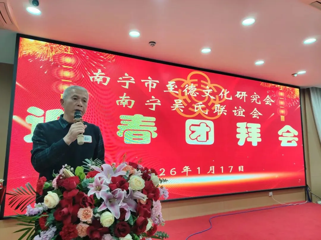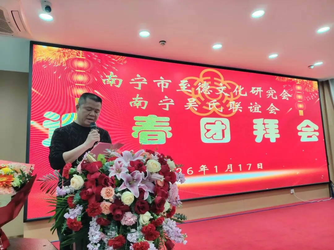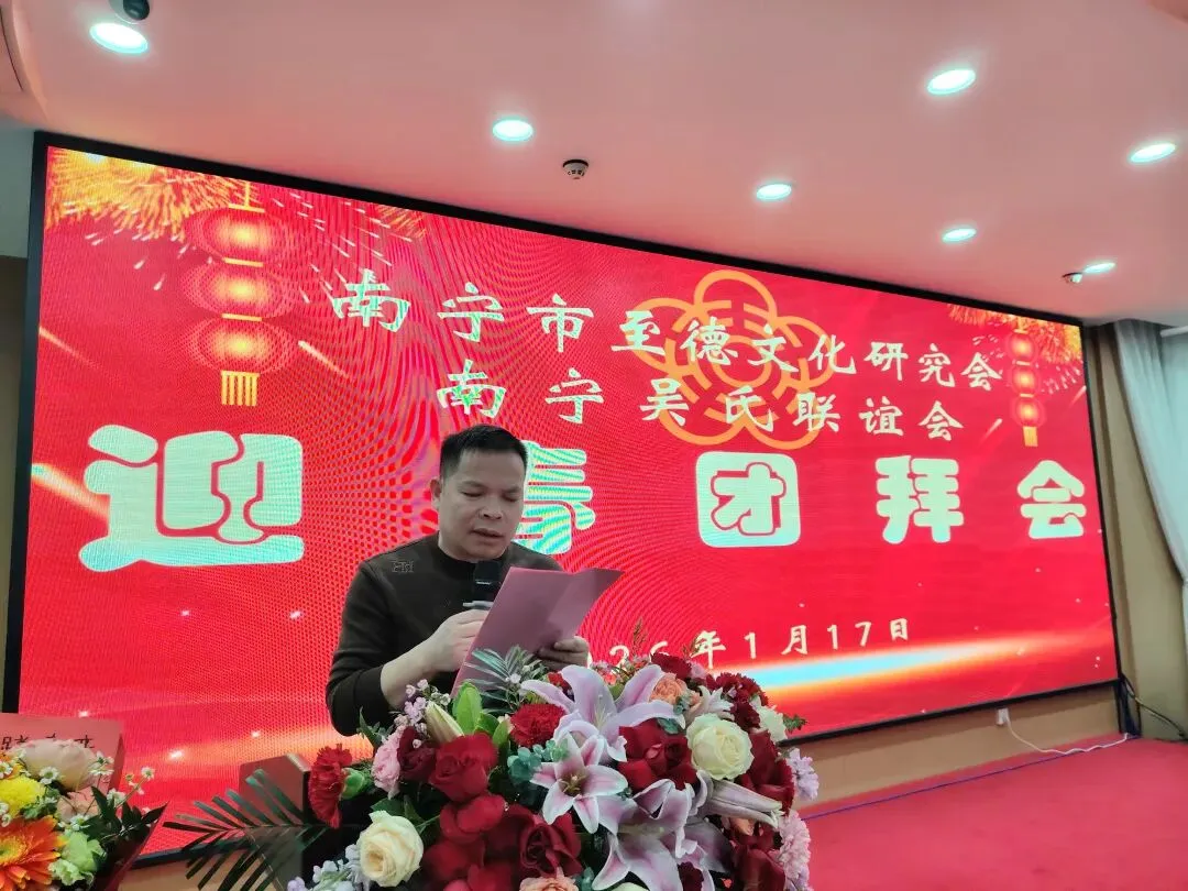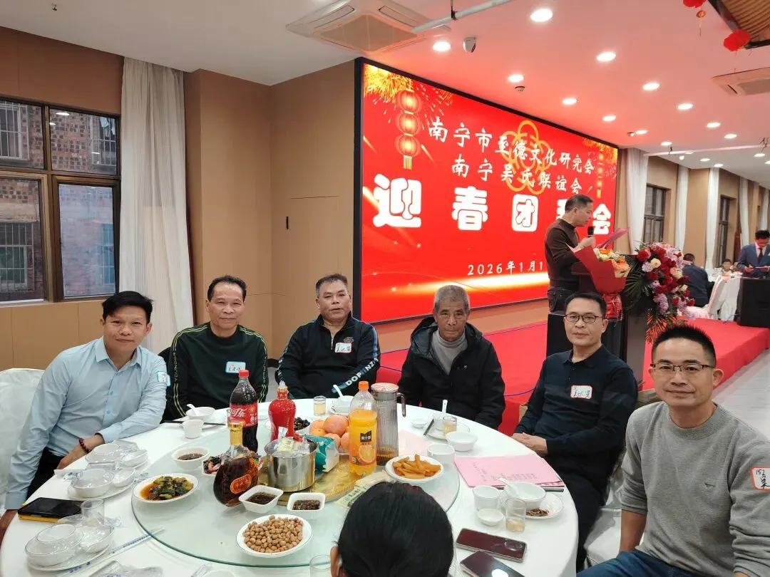 【南宁吴氏】1月17日下午,南宁市至德文化研究会、南宁吴氏联谊会2026迎春团拜会在大惠丰江北店举行。会长吴晖,名誉会长吴晓明、吴长勇,执行会长吴荣举、吴艳梅、吴俊杰、吴清山、吴汉城,秘书长吴善辉,广西吴氏经济文化发展联谊会执行会长吴金祏、吴东等220多位宗亲参加了团拜会。