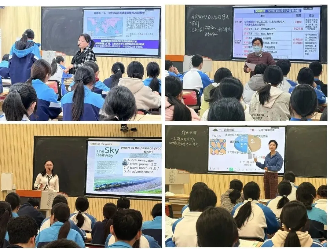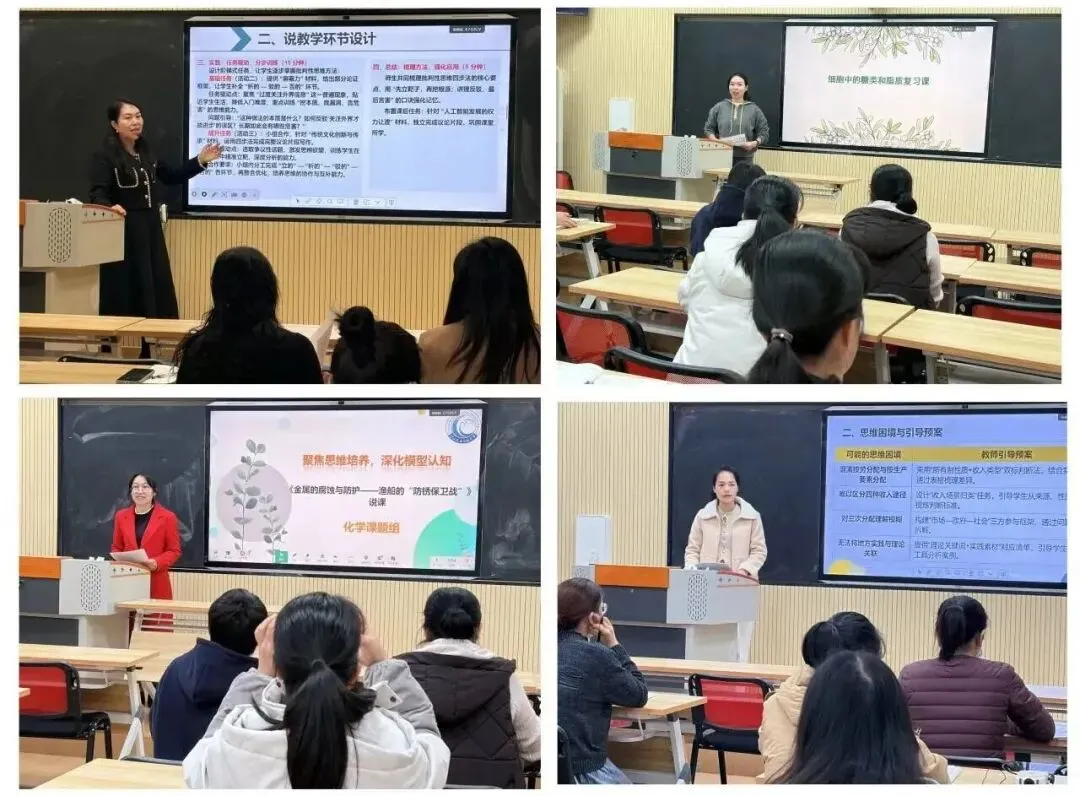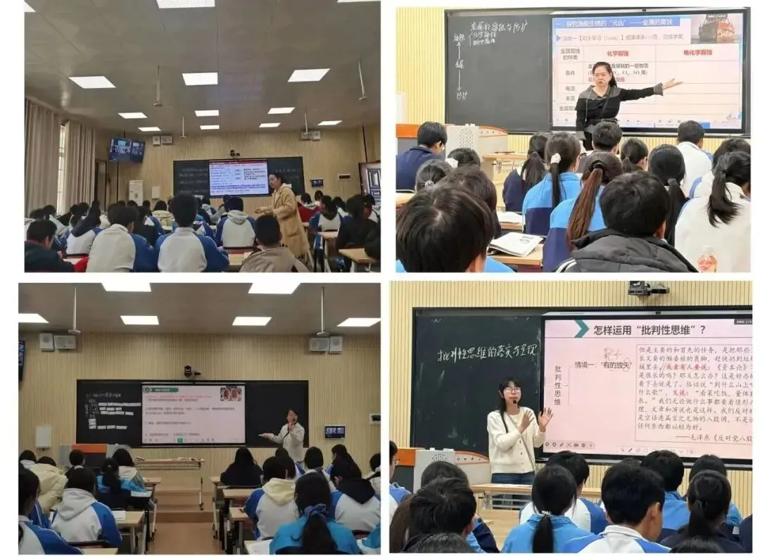 第二阶段,各学科上课教师紧扣课程标准以“思维生长”为核心进行课堂教学展示,采用“思维激活—思维引导—思维呈现—思维拓展”四环节设计,运用问题串、小组合作、情境创设等多元策略,让学生思维在探究中碰撞、在实践中提升。例如政治课通过真题辨析、思维导图、案例探究,培养学生分类思维与逻辑建构能力;物理课以“力与运动”为纽带,借助典型例题、航天热点情境,强化模型思维与逆向思维;化学课围绕“渔船防锈”真实情境,通过实验探究、方案设计,提升科学探究与创新思维;历史课以“茶”为线索,结合时间轴绘制、材料分析,落实时空观念与家国情怀。