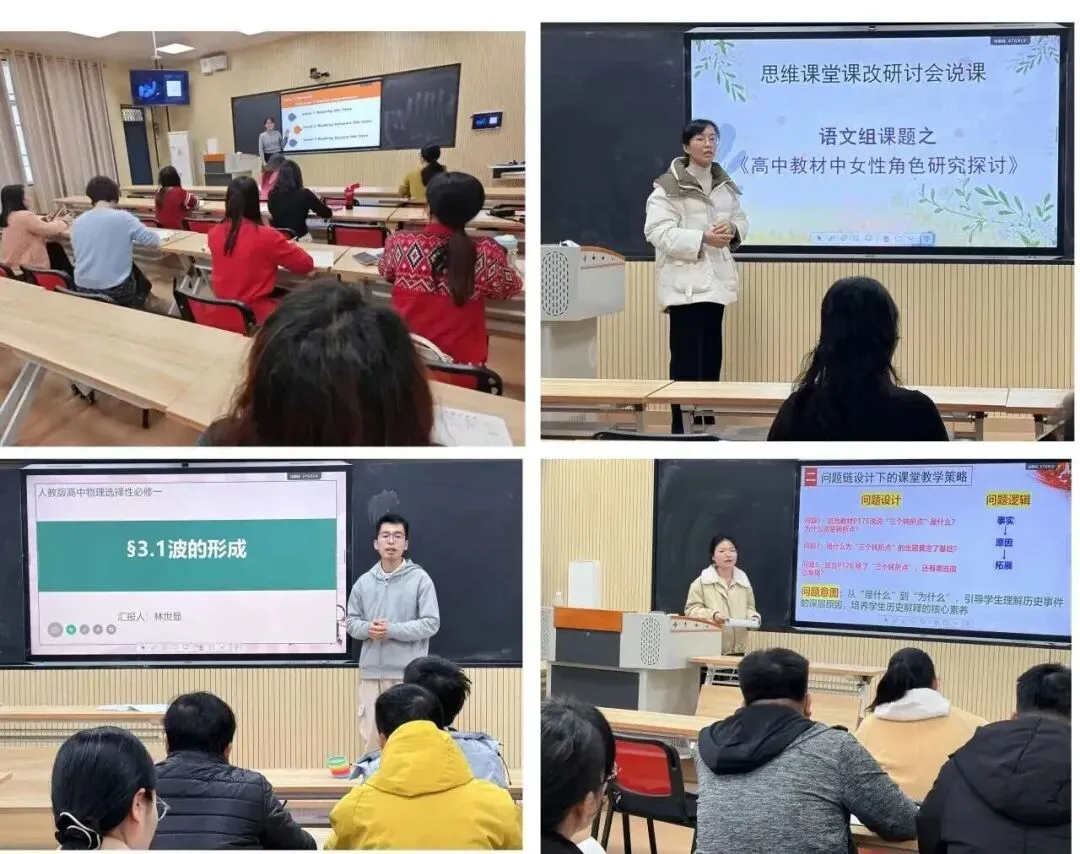 第一阶段,各学科代表教师围绕展示课例的“思维培养目标”进行15分钟的说课。说课中,教师们精准把握学生思维痛点,针对性设计教师引导预案,如政治学科中区分分配方式、物理学科中破解力与运动关联难题等,以思维培养为核心,融入问题链、任务驱动、情境创设等关键策略,以“导学+小组合作”为载体,通过分类思维、逻辑建构、模型思维等多元训练,实现从知识传授到思维赋能的转变。